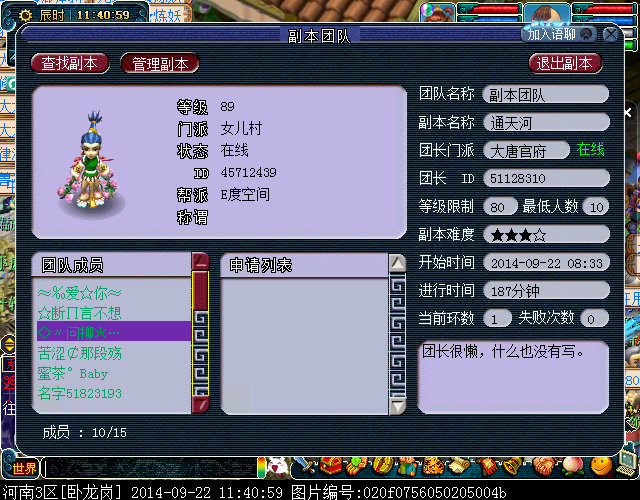 我的好友“问柳”,在我早上刚上线,就问我在干什么!她是卧龙岗老玩家,还是“E度空间”帮派成员,在我进入长安城时就一直留意我,她的游戏里的老公也认识我;她游戏里的老公曾经告诉我,他游戏里的老婆是89级的,请我在89级带队时多关照她!问柳想让我创建副本,但是我的银两不够3万,无法创建副本,她就让我加入另一个“通天河副本”。