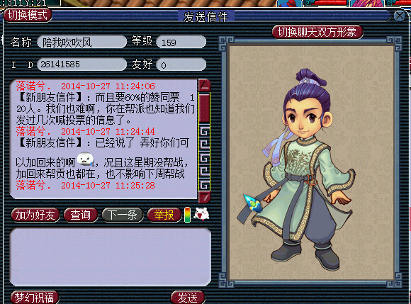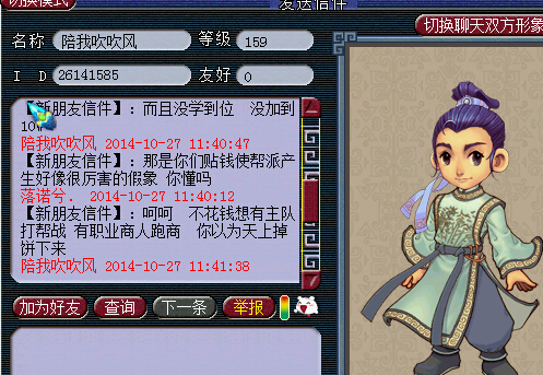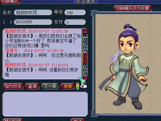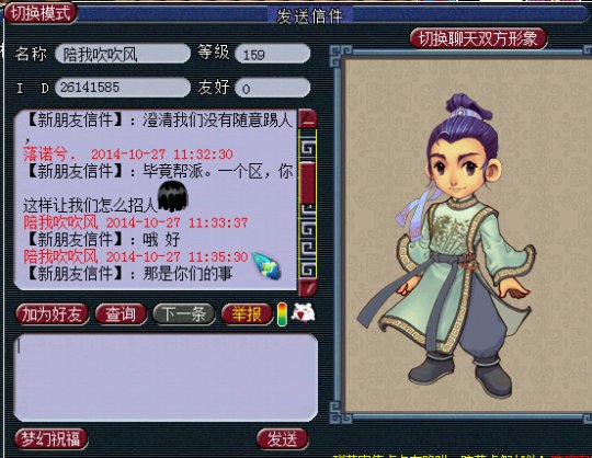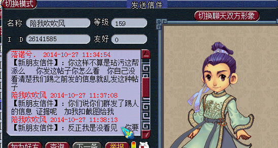 没有图了,然后他下掉了。说实话 一开始只是打算跟他说下,发个帖子澄清下,后面被气的真心想开号杀他。但是又怕杀了他又在三界唧唧歪歪的,玷污我们帮派,就忍下来了 帮派群里也有人刚刚反应了,说这人帮战的时候,别人组他还嫌弃这嫌弃那,自己又不是很好的号,事情又多,上上周末夺旗,想让大家多杀杀怪得得帮贡,一些打满F的人也多嗨一下,除了他,整个帮派的没有意见,就他一直在唧唧叫,说快点交7什么什么的。又吼又叫的。他一吼,搞得帮战主力就密我喊我不要那么快交7.也喊他,然后又在帮派频道BB一些话 其他我也不想多说什么了,放弃了自己的午休,弄了这个帖子,也是你喊我发的,你看到了扣我下吧,看有没有漏掉什么,唉。