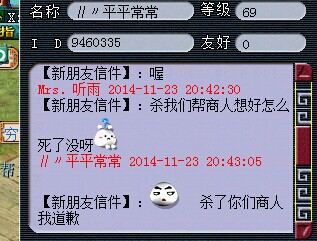事情是这样的,我们家族都是以前抱着最后一梦的心态入驻兰亭序,一直以来都是家族内部很开心的玩游戏,从来不惹事,也从来没有和任何人有过什么过节,但是今天无缘无故三个69的大爷,杀我家族成员,原因是《小苹果帮派》帮主丢了31个彩果,我们家族三个人同时在这个帮跑商,有人看着不爽,直到我们家族的小伙伴跑到东西了,那三个69的在野外杀我家族另外一个不关事的成员。 连人都不知道是不是就杀,是不是兰亭序的69大爷都是这么叼的啊