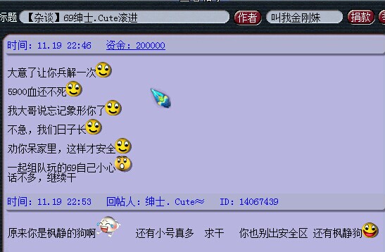 好像俩69的吵起来了,这边的出500W喊我们杀69的我们没去,枫静去了 昨天拿ST号点绅士,一个破血没破死绅士兵解了, 然后今天绅士带了他自己大号175HS,心碎来强P, 被他反杀了,不知道泉导掉了什么装备没。 泉导一被反杀,掉了装备马上就开枫静来点HS了,不过HS号缩地了,枫静被通缉。