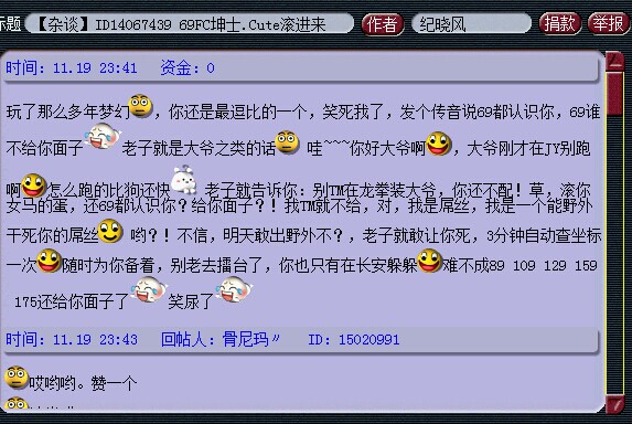 相关八卦:梦幻西游2手握5FC的龙拳区霸事件:字母帮要垮了! 昨天忘记发了,心碎浪子被弄死了的, 枫静号后来点了两次天使君,又被通缉了,今天到现在还没上。 蛋蛋的忧伤 又拿小号在那发传音了,哎,真贱,难怪会骂自己是孙子。