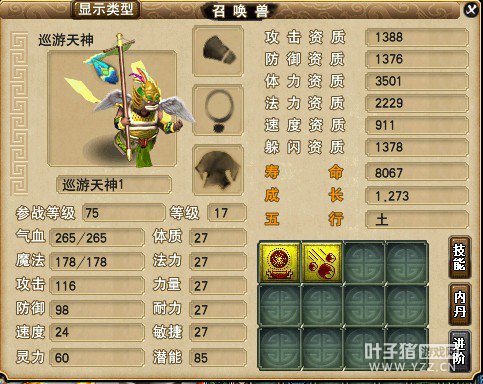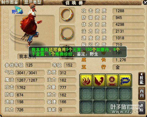 目前任务在用 吃的一个攻击元宵 没过几天就被豆斋果原封不动的还原回来了 宝宝装备不加伤害 加了4点敏捷 如果和出来这样一个真宝宝的 成本不说了 卖价1500不算高吧 合这只成本不超过40W 至于总投入 我想说 合真宝宝就能一次成功? 总投入不及合真宝宝的一次投入 本人玩梦幻这么些年 主要收入来源就是合宝宝卖钱了 和真宝宝真没赚过 算下来赔不少 但是合野宝宝 真心赚了不少了 很多人就说 野宝宝的ZZ垃圾 我只能说你应该多合几次宝宝 多试试 多看看 还有人说 野宝宝差50个属性点 但是 除了花如意丹洗 又有几只真宝宝多的这50点属性全都多在攻击上? 下面上个图 来比较一下 有人说野宝宝等级升的高了 差距就小了 59 69 89 109的基本很少用 这还是比较客观的 除非类似此楼的宝宝ZZ 成长 勉强还算不错 只是技能少点 成本5W 如果练到99J 只吃速度元宵 273的成长速度够用了 恶报秒杀无压力 觉得很多人存在一个误区 本身买不起JP 又不愿花同样的钱买比那垃圾宝宝强的野宝宝 很不理解
