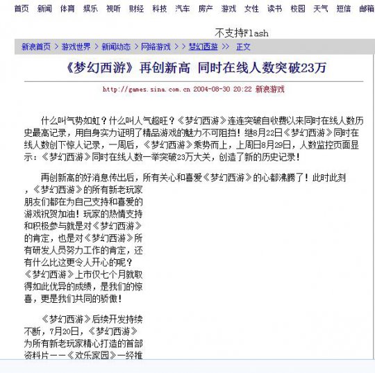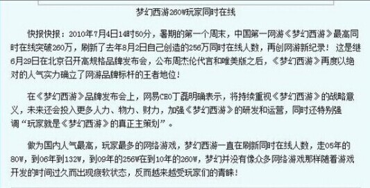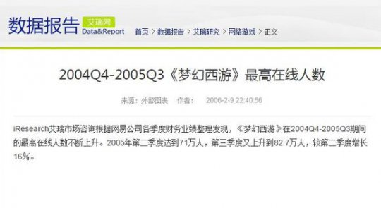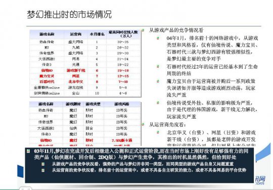 X轴表示有效玩家数量,Y轴表示时间。 T1,T2,T3分别表示上升期,平台期,衰亡期。 如今我们可能正处于T3时期,时间是不可逆的。即使是梦幻有再牛的策划,只能在T2时期努力延长这一时期。 在T1与T2交接以及T2时期,梦幻西游的策划团队在梦幻的核心基础上提出了一系列深为玩家喜爱的资料片。 第一部资料片《欢乐家园》,这部资料片的推出,在楼主看来,是梦幻坚定了以社交为基础模式运作,事实上后来的发展也印证了这部资料片的成功。 让我们回到《欢乐家园》之前,梦幻西游的策划团队何以能够推出改动不小的资料片呢,任何新资料片的退出都不是一个天马行空的想法就足以付诸实践的,需要的是对网络游戏市场各方面因素数据分析。 下图引用04年网络游戏市场形势数据以及梦幻西游所取得的成绩。 接下来是梦幻西游04年-10年的在线玩家数据,这一时期也正是梦幻西游上升期T1,T1与T2的对接。