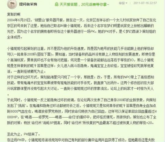 相关八卦:梦幻西游2浅谈175级对梦幻系统的冲击续:谁是开拓者 在网上主流帖子都是水贴、估价、直播取号、屠帮复仇贴、毅力逆袭贴的形势下,楼主作为一名娱乐玩家,非职业打图大唐的帖子取得了小小的关注,让楼主意识到,梦幻至今的基础仍然是普通玩家。 上一篇帖子是开着号写的,时间比较匆忙,行文布局较乱,有很多想说的话也没有完全地阐述清楚,今儿趁着上班无事再开一贴。 附上个帖子地址:http://xyq.yzz.cn/skill/201412/896725.shtml 前两天,看了@魔术先生qiu 这位朋友的帖子(帖子链接),引发了我对梦幻的较深层次的思考,于是就有了如下的留言。 此外,在看另一位朋友的帖子时,对于召唤兽装备是何时出现的,又产生了分歧。 于是,楼主昨天下午把2004年到2008年的定期维护公告全部看了一遍,既得出了召唤兽装备是梦幻第七部资料片《法宝传奇》中出现的,又加深了对这款玩了9年的游戏的了解。 接下来楼主会粘贴一些大家所说的,游戏系统平衡性的修改。 当下,五女儿是很热闹的,当年女儿也是很热闹的,因为一个人——小猪妮妮。 导致了气归、命归等回血特技的修改。 当年的修改,并不能归结为一个人,一件游戏道具,小猪妮妮对于游戏道具的运用打破了游戏平衡,一个游戏的平衡被打破后果是很严重的,就像是统治阶级的意识形态受到了破坏性的挑战。 Bug,是游戏都逃不开的一个玩意儿,梦幻也不例外,当年购曱mǎi剧情道具,可以购曱mǎi定魂珠归属此类。 还有一些闷声发财的玩家与其说靠着脑子,毋宁说是“苟shǐ运”发现了游戏的bug,以一种不正常的,变曱态速度的方式获得了大量的高值游戏道具。甚至于依靠领取礼物的zàng宝图都足以发家。 这一些列的bug极其破曱坏游戏平衡,对于游戏就如同dú曱瘤一般,也是众多玩家所憎è的。 关于小猪妮妮 似乎玩家都是在抱怨梦幻的削减,对于现有游戏资源的整改,实际上,梦幻为玩家所做的提升亦有不少。譬如说,pt的多秒、如今TG、FC、WZ等等的多秒。 谈一谈楼上所贴图片中阐述梦幻如今可能处于衰亡期。 一款游戏也属于一种产品的范畴,产品就有其生命周期。 对于玩家而言,梦幻的生命周期并没有这么复杂。(原谅楼主的渣渣画工)