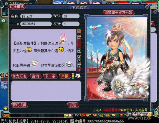 此人也是早期欺负129TG小泉号的 元老之一,切入战斗的时候,忘了自己临时全掉了(仇家追杀直接下线过),速度居然还慢了,逆风局万幸还是把他干掉了 部分朋友表示得饶人处且饶人,看了上百次的屠杀直播,开始可怜诗情画意了,其实我也说了,抛弃年少这么简单的条件 就可以结束这场杀戮,但是诗情画意至今没有服软的迹象,当事人也死皮不要脸的赖在诗情帮,假如饶过他们,诗情画意又将在龙拳嚣张跋扈 这就是我的游戏方式,朋友不必为我操心,我不累,相反游戏中的打打杀杀给我带来温馨和快乐,因为在这个时候,你看到的是最真实的游戏情感 谢谢,朋友,小心被追杀