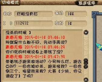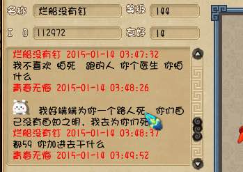 相关八卦:史诗级巨片:龙拳枫静向人头2000个冲刺 事情是这样的,晚上没有事做,看到一堆69的封妖队伍,于是就点了,进队也没看。结果冒出一队59的玩家,跑到野外封妖,直接就是点BY的,第一回合就倒了一个,一个空血,我说跑吧,这些59大爷非要说继续,我说了几遍跑,,第二回合又倒了2个,我就点逃跑了。后面大爷什么都不说就发飙了。下面直接上图,请各位评评理。 前后就是这样了,带了钱不说,非要装大爷被怪搞死。这是他的大号