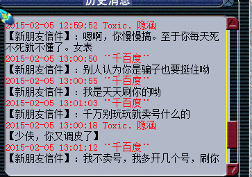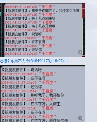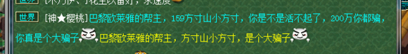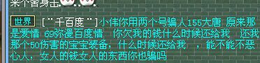 事情是这样滴,楼主卖个东西,然后女表钱不够。然后就丢了个60白板普渡头说有钱再赎回来。 因为在YY听过声音是真女表,所以就答应了不是,毕竟人之初,性本色。 后来嘛,女表找各种借口不还钱,楼主就不乐意了,200W是不多,楼主也不乐意被耍是不是? 就开始威胁要追杀她,一开始她怕了说会赎回去,后来不知道是不是找到一群护B大队了,开始各种刷楼主骗子,反咬。甚至叫嚣着要皇宫,后面有图,很精彩 这是女表的大号,159DF,那个千百度的号是LG。 当天晚上似乎找到护B大队帮她了,叫得很凶。说好了11点半打生死,还一直在传音。 那晚女表很凶很凶的啊,说什么159打170。什么废物170不敢接皇宫。 把楼主这小心脏都吓怕了,以为是159大爷,后来还是硬着头皮,喊上几个好友接了。 时间定好是11点30分开打。 结果时间到了,双方人也到齐了,战书他们也接了。 结果要点他的时候说对方没有申请决斗权。 然后还要手把手教他们。 看到这里,楼主似乎放心了。虽然楼主也是第一次打皇宫。 他们墨迹了大半天,后来似乎知道要申请决斗权了。 不过又似乎没有解锁,还没解锁就等呗,等半个小时还是点不了。 原来是有DL啊,DL你也来护B,好好刷你的经验不行吗? 后来到差不多11点55的时候楼主又点了一下,突然切入战斗了。 结果发现他们只有4个人~~~好吧,楼主错了,5打4。不过你们战书接了是不是表示你们准备好了?从8点开始说11点半打皇宫你到现在还整不齐人来打怪楼主咯。 楼主为了打这皇宫倾家荡产,都没用过这么好的卡,结果你还4个人,还变个乌龟卡来敷衍我。 我才是受害者好吗,F都白打了。好吧,你说重新来过就重新来过,然后因为他们说重新来,刚才是因为在换人。那就12点继续咯。 然后因为他们说重新来,刚才是因为在换人。那就12点继续咯。 楼主自认为讲话还是很温柔的,5打4还有点不好意思。 结果女表,太伤楼主心了,一开口就喷。 他们说打,然后又不说时间,让我们等着。 我怎么觉得有点像小学生说你等着,我去叫我哥。 我们不是不能等啊,那倒是说个时间啊,第二天都要上班呢。 后来一直等到20分吧,实在等不了就下了。 然后昨天,这女表竟然来杀我们帮69商人。 作为一个帮主吧,我觉得商人就是逆鳞。私人事情怎么整你怎么陷害我我最多就平时杀杀你,既然你动我们商人了,那没什么好说的了。安全期一到就是死。镇楼图是我们帮的人杀的。楼主上班上不了梦幻。 当时说要三界发帖揭发她的时候她说马上还钱。不过那时候我已经下线了,后来上才看到的,就没拿到钱。一开始他说要卖号了,不还钱了。随便你搞。那张图还没找到,有的话会继续上传。这是今天我上的朋友的号跟他的聊天记录。 他皇宫不敢打之后现在一直在刷我骗子。我好怕啊,在这区那么多年第一次有人刷骗子,有点兴奋,会出名吗?下面大家来看几张图,作为一个机智的方寸,给大家分析分析。 下面第一张被她刷的曾经是她的护B者之一,世界狂发传音向他求婚的。 这时候她刷的时候是刷“小伟”。 再看接下来精彩来了,就是镇楼图我们帮的人杀了他之后,刷的内容马上变了。妈蛋,虽然杀你的是我们帮的人,你也别强行把我跟另外2个人扯上关系吧。我也是有点服了......另外我是168级,不是159。下次刷的时候麻烦更正过来,打皇宫的时候你还说我170,现在又说我159,你以为我是小象精灵吗? 另外2张图找不到了,只在QQ群里找到这张图。当时楼主是上线后才看到的,你看这怂样,后面怎么变了个人一样。我不就说发帖揭发你骗子嘛,你都说你要卖号了还这么怕,那些给他护B的人进来看看,反正现在是谁出头杀谁。护B就算了,不搞清楚事实在那里狂喷。 我鼓起勇气点一队。159,2ST1MW1LG1DF,队长MW是护B队长之一,其他的全挂机。3个人切进去差点被直接反艹。楼主涨记性了,以后必须得打F,MW秒过来2000血!还是很凶的。差点都想逃跑了,还好第三回合其他3个反应过来没挂机跑了。最后逆袭了。 还在坚持不懈地刷着我,楼主是要出名的节奏。有没有同区吧友,跟她说说能不能把我等级改过来。 女表又有新点子黑我了,加进群里说我没发她小号奖励。对我真好,一直不把这个事情说出来。 我好感动,那么多脏话都说尽了,竟然这件事一直瞒着大家,真的是对我很好啊! 因为女表已经被群主踢出群了,所以只显示QQ号码。 你说上周把你踢的,我上周不发奖励?我坑商人钱?我不发奖励商人会跑商?还在继续秀智商下限我也是醉了。 我谁的都不骗我就骗你? 小编点评:骗子什么的就暂时放一放吧,建议姐姐您先去学下怎么皇宫生死好吗? [编辑:夏大雨]