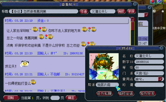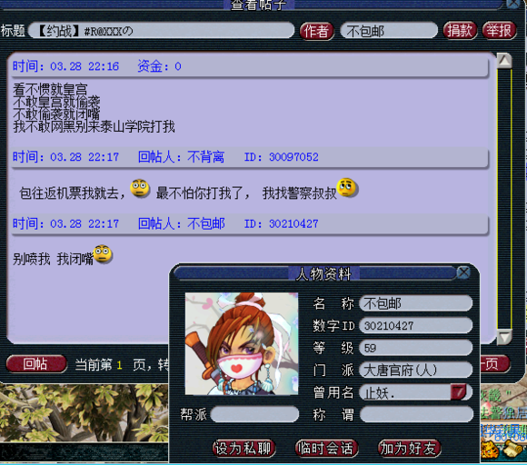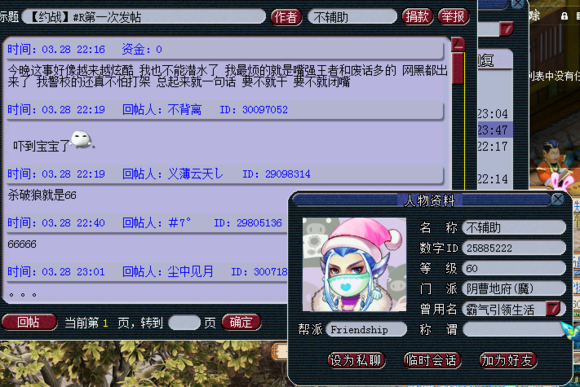 LZ这里说明一下,这个区的水很深,因为LZ以前是桑浦山的,在桑浦山有好几个好友转区来了这个区,后来我们区鬼了,我也过来了,但他们都没玩了,虽然我很想跟他们一起玩,但也不想去找他们回来了,解脱了挺好的,玩梦幻是需要付出青春的。。结果这货因为认识我以前的朋友,就说我跟朋友的区别咋那么大。。。。。。其实最主要的原因还是上次这个人惹了事,答应接别人HG,结果别人打好F,它却放鸽子,搞的别人发火,闹了好几天,LZ当时就说了几句放鸽子也不好之类的话就被惦记上了。。