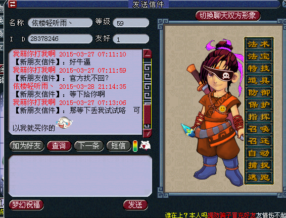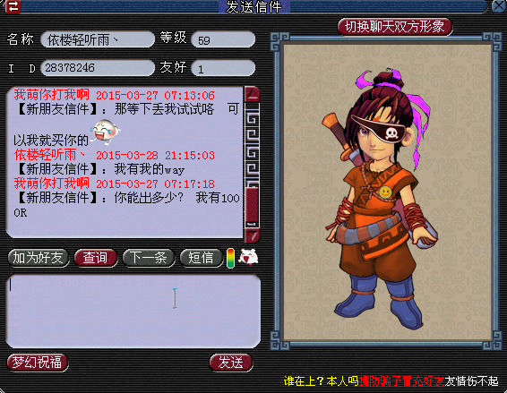 相关文章:高神居然不翼而飞 是bug还是另有其因? RT,楼主垃圾HS一个,今天在世界收水清腰带和5孔装备,后来有个小号M我,然后用老套到不能老套的骗术来骗我,再后来发生戏剧性一幕。楼主在喊世界,骗子来M我了,还是个59小号。 卖装备一定要加QQ吗,就算是朋友的,留个ID不行吗