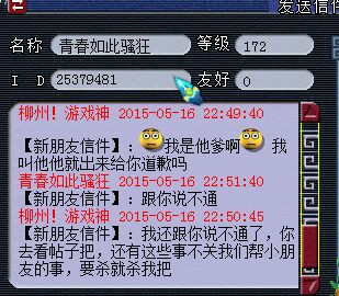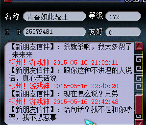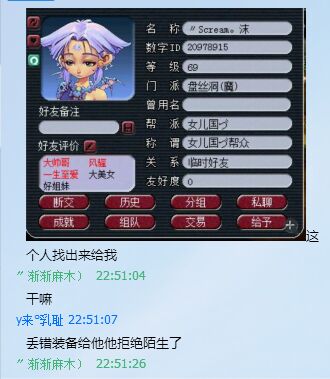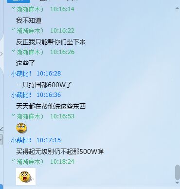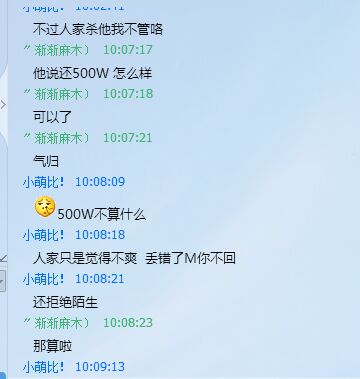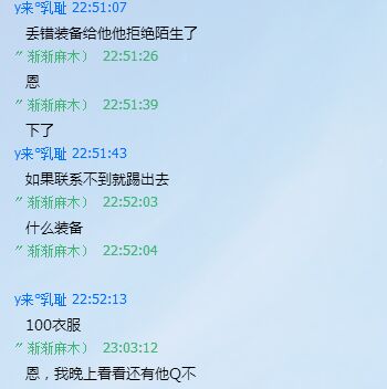 相关文章:暴躁外皮谈交易制度:形式不同本质一致 原因是那个109大爷丢错东西给我们帮一个69魔王,今天大爷丢装备丢到了我们帮一个女儿那里,然后那个奶瓶来找我,要我帮他问那个人还东西,然后喊我帮他问问,那个奶瓶我之前认识的认识几年了 我就帮他问了,那个人在了,我马上问,然后那个MW说装备卖了500W. 我就喊他还500W给人家,然后大爷今天帮战就米我了,问我事情解决的怎么样了。我就问他500W要不要,他说不要,我就说了帮战完在说,然后他就说杀我们帮的人了。。 他喊我找那个人出来道歉,不道歉就屠我帮。这关帮主毛事啊 他还说了,丢错东西给那MW,就是我们帮的事