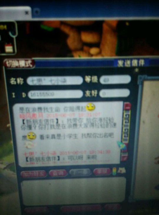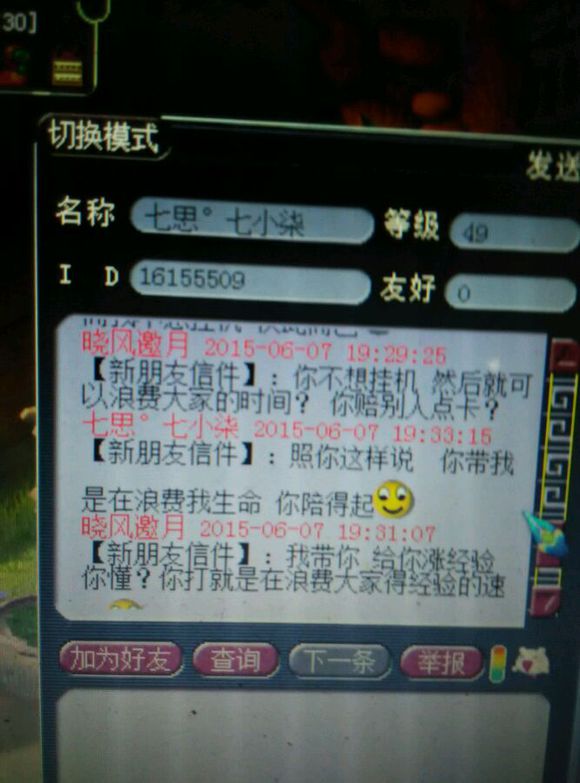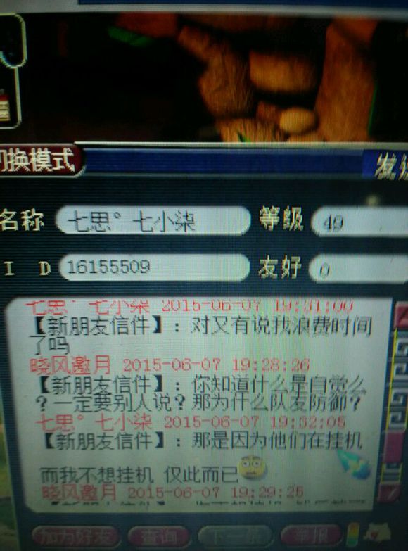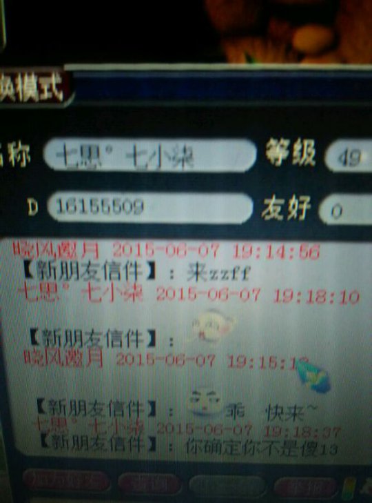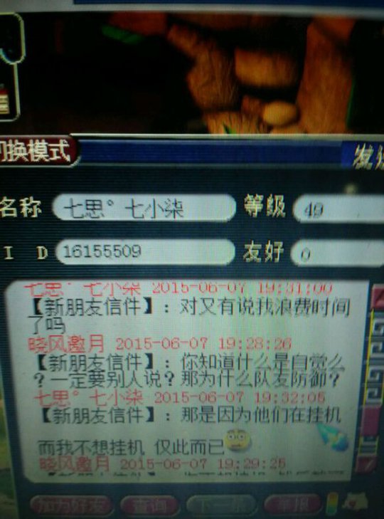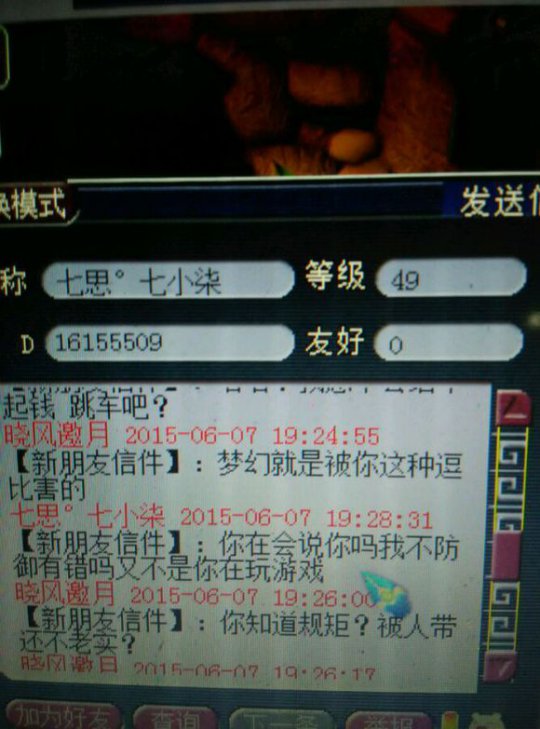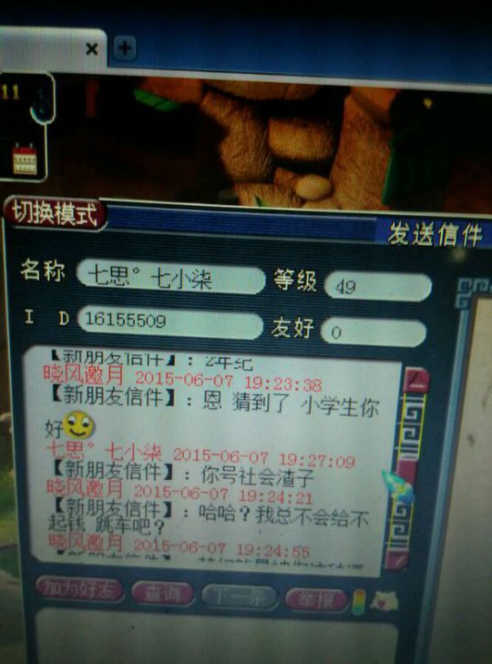 总算不用亏2w省了5000 心理想想也就算了 于是楼主继续带鬼 然后我发现47级的大爷带着个带饰品的雷鸟人 一直在帮我打鬼。所以我又m了他 大家看好时间,每次刷完一个鬼,我就只能m大爷一次 结果高冷的大爷就是不理我 于是我心里想着,难道大爷挂机挂错了?挂成横扫?可是不对啊怎么每次都能扫到主?终于,在大爷使用了一招破血后,我才发现 你TM在逗我? 然后在抓到第三个鬼后,大爷跳车了 于是楼主只能无奈的约他来zz退钱。毕竟楼主还是很有节操的 然后我只能质问一下大爷的年龄!真相就在这里