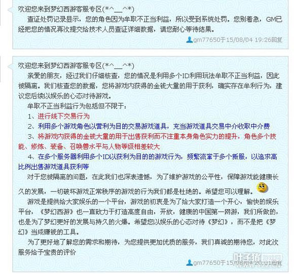 结果出来了。 我就是一个普通的娱乐玩家。我也没想赚钱,我就想消磨消磨时间,自己跑商。自己刷经验。自己产出的东西,开个储备店。还想把修炼搞到7修满。 没出过一毛钱菜,不要问我要藏宝阁记录,我藏宝阁都没登过。从来没有在藏宝阁买卖过东西。现在点卡这么贵,赚的钱买月卡之后。多余不了多少钱,每天5个号10个宝宝秘传。消耗的储备金,现金,环。能自己刷出跑秘传的就很不错了。 娱乐玩家根本没多少时间上线。不要以为5开多赚钱,其实和我一起搭档副本的娱乐玩家。那个不是往里面贴钱了? 上次申诉,我不满意,又重新申诉了
