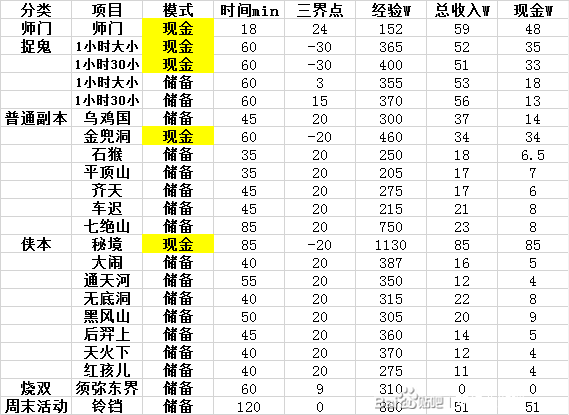我玩175好多年了,经手的号有20多个,从难民到近全满化9,从史诗难度的五个号到化9五开都有,应该有些发言权。本帖统计的所有数据都是我散人时期计算,通过做完这个任务后的现金、储备金减去起始的,各做三次取平均数,相对精确。考虑到想要出菜的散人通常是下班玩3-5小时,没时间也很难组到天罡地煞地宫归墟无相高X神器等任务,以上本帖不予讨论.. 我只是分享一下自己的观点,有错误的欢迎指出轻喷。 先写在前头,下班玩3-5小时的休闲玩家,每月出菜约700-1000人,然后本帖按照我心中的优先顺序介绍175的各项任务,当然大家心中排名肯定不一样,我就是抛砖引玉供大家参考,好了开锤: 一、师徒任务 师徒任务的综合收益应该是略高于师门和打图的,175两个40级师徒小号的全收益是:现金+储备20W;修炼经验40点算12W、爆一次100修炼经验算30W;300善恶+700储备善恶,两个小号的话就算平均每天可以换个60的武器火区约17W,不爆修炼总收益在50W以上。 这任务适合修炼不满、要补猎术或者4修的号,我每周爆1-2次修炼经验,很激爽,主要时间短,老手两个小号做完大概20分钟出头。 二、师门 这不用我多说,总收入60W左右,刨去成本不要环的情况下日入40W问题不大。而且有个很大的优势是给三界功绩。 三、打图 改过之后每天前40次打图是免三界功绩的,175的话DF和PT小姐妹打40次图运气好时间可以控制在15分钟内,法系固伤1回合贼王的可能15-25分钟也能打完了。175出图率一半多点,每天约20-30张宝图不等。操作可以参考下图,第一个7是CA,第二个是HS的,第三个AL,第四个CS,第五个ZZ,第二排的飞行棋稍微漏出来一点能点到就行,主要飞JY西凉这些地方,物品栏不用关掉,打完右击直接飞酒店。我是神木林挂单秒不带宝宝1回合,贼王群秒宝宝打主也是1回合。 四、捉鬼 175需要开现金模式的只有捉鬼、秘境、乌鸡国、金兜洞,副本相关以下再介绍。175现金捉鬼30个小的收益在51-53W,15组大小在55W出头点。我个人觉得单小时收益50W以上的任务都值得做,虽然很吃三界但是可以挂机,物理系当我没说。 要注意以下几点:三倍和回梦丹给的都是储备,就算三倍用完了,单吃双倍捉鬼还是50W的收益。每周4小时的三倍多出来的储备金可以点技能补三界功绩。另外每周不可以捉小鬼超过300个,否则不会再给现金了,建议大小搭配。 不挂场景的话,这任务十分值得花完14小时双倍,环和炼妖石乐器都是白给的。 五、牧场 相关帖子很多,随意百度一下吧。偷懒可以专精珍惜熊猫,模型大比较好点,养的人多哪怕真的断了也好买,我们区12W一个窝。175现在卖收购珍惜50W多一只,可惜要100多三界,大家酌情考虑吧。积分产出全都换修炼果补宠修,满修号考虑饲料回血。对了,其实高级牧场也没少太多积分,就是操作起来贼麻烦,可以考虑能养在池塘的禽鸟,以及可以养在装饰上的哺乳类,树上水里抓一下就行。 除了搞牧场,有个好的家也能省不少钱,比如满厨紫气宅,双倍烹饪几率应该能到70%左右。 最主要是大型庭院的种树,一定要种满,给的储备金超乎想象。怕麻烦的同学可以只种6盆三级种子,花圃很便宜,三级种子也很好收,也没有两级种子那么麻烦,2波周期过后6盆一起换,平时摊位看到2W多的三级种子就买下来,会给三级种子和兽决,就是兽决的几率有点感人。 六、帮战 这是个非常容易被忽略的项目,但实际上操作得当175帮战的收益时间比也并不低。 我的操作手法是不论单开还是五开,清体力到300左右,保证死一次不会出去。以周五为例,进去直接杀树,或者点对面散人和低级队伍,如果运气不好杀人的时候被对面高级队伍点死,就开始杀树不要杀人了,因为再死一次就出去了,亏帮贡。175因为等级碾压,只要不是129以上太烈的队伍都打得过,这也是帮战值得打的主要原因。第一棵树18帮贡,后面2点递减,杀到不出帮贡就开始杀人或者直接死出去。175散人6点帮贡一个,以这样的手法操作,除非对面没有可以点死你的队伍,否则半小时以内可以搞定。 帮贡可以点修点技能,作为五开迷宫可以是,散人很难组队,但是帮战的话只要帮不是太垃圾还是好组的。 对了帮战这一块提醒一下,有实力的可以参加一个固定队和帮主谈一下工资,没有那么难的,上来哪怕5须弥5隐功冲大部分队伍都会被你们唬住。 对于平民队伍要注意不要太忽视109和129五开的须弥,可以像我一样选择先清他们的须弥,人不用管,真的有强力物理系打死你一个人也没事,下回合拉起来呗,一般1-2回合就清完了。 七、三大现金副本 五开170的难民队伍就捉鬼日常6小时日收益在100R左右,129的1+4或者122八小时也差不多。而散人不像五开有那么多时间,合理分配有限的时间做收益最大化的任务才是王道。 除了特殊活动,以上五项折算成1小时都可以到50-100w以上的收益,散人日常还有很大一块是分配给副本的,以我这么多年的经验来说,没有一个副本是比上面五项任务收益/时间更高的,哪怕秘境也不行,所以十分建议散人在做完以上任务后再考虑副本。 因为我的表格太大了,我放在最后吧。这里总结一下,除了捉鬼,还有三个副本值得开现金模式: 秘境 85min 1130W经验 85W现金 乌鸡国 45min 300W经验 35W现金 金兜洞 60min 460W经验 34W现金 时间随队伍有出入,但是收益我取了平均数,应该比较精确。好多人觉得秘境太难了,太费时间了,前面的收益太低了。你说的对,但是很值得。下图有第六关和
