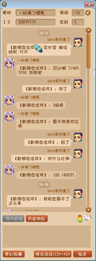 刚开始找抓鬼的 看见他的还可以 就过去组他 由于是新手没有金 就问他支付宝 微信可以不 后面主动问我需要金不 由于怕是骗子 就提出先给一半 给了他30就把我提出队伍里 比较心寒 叶子猪梦幻西游玩家群:1群 325703083 (2000人),2群: 330102322 (千人);3群: 424986787 (游戏疑难解答);4群: 330518295 (商人物价);5群: 1063086037 (疑难解答);6群: 1045753197 (春心萌动);7群: 787195090 (活跃互动);8群: 720665628 (全民PK)