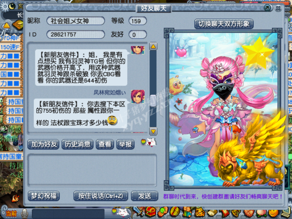 楼主传音无意看中了一把武器,各位猪友帮我看看多少能秒。 是这样的,我有一个羽灵神的天宫号,刚好缺把武器,今晚看了藏宝阁,都觉得没有合适的,就无意看到这个传音,想想新角色的武器不可能那么贵,就去试试毕竟真的不太懂装备价格..每次买装备都去CBG搜索一下价格。