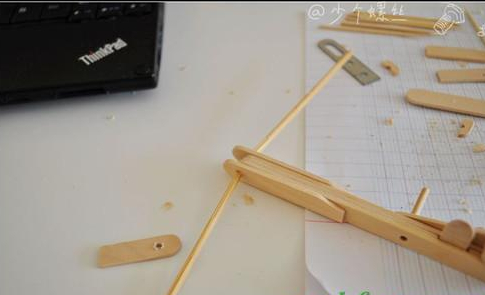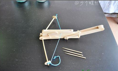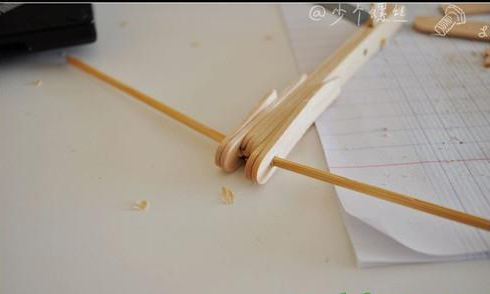 将箭匣箭槽组件和弩的主体部件用前面剩下的小竹签通过前面钻好的孔组装起来,如图所示。在弩翼(竹签)的两端用胶水粘上两个小木片,以便下一步用来固定弦。最后找一段尼龙绳,按照图中的样子固定好,如果你前面都没出错,那么连弩就大功告成了。