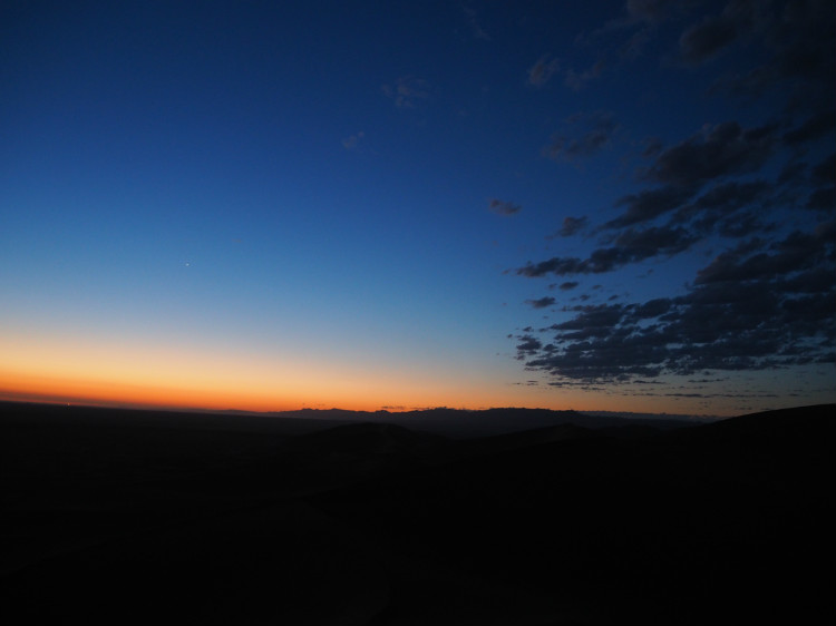 买了票,租了纺纱鞋套,准备穿越大沙漠,爬上山丘,看日出,纺纱鞋套真心的不防沙啊,索性光脚,不想说,在沙漠里怕山丘真的是累啊,但是乐趣无穷,旅行就是可以和身边的陌生人迅速的成为亲密的驴友,爬累了,一双有力的手会来推扶你前进,走累了,一双手温暖的手会拉你起来,多么奇妙的感觉,无形中形成了一支穿越沙漠的小团队。 |