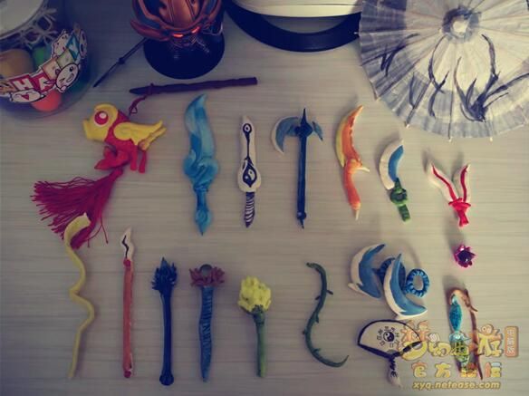 某天突然有了想做十八般兵器的想法,现在正好梦幻里也有了十八种武器。 楼主花了一天的时间,弄出了黏土版的简易梦幻武器。 希望大家喜欢。