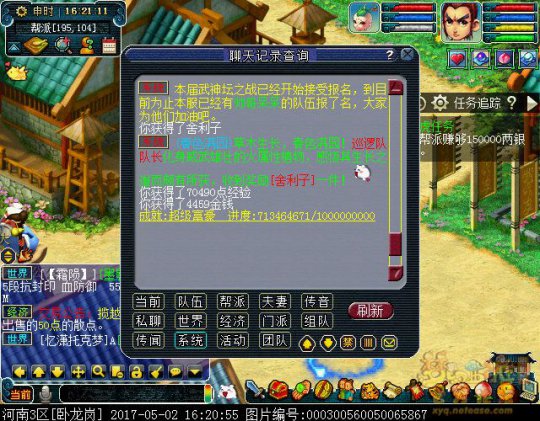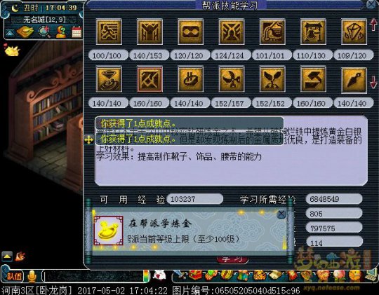 【时间】2017年05月03日 【作者】李永生 【摘要】建邺城巡逻队派至长安城的角色,89天宫巡逻队队长,炼金术已经学满。 【内容】昨天下午,来自河南3区卧龙岗的89级天宫巡逻队队长,正在努力跑商,提升生活技能。 受到来自其他89级玩家的邀请,去建邺城看一场戏。