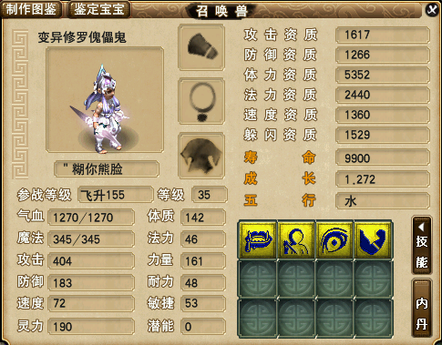 楼主从去年的5月份重新回归梦幻里,沉迷在一个又一个的变异宝宝的风采里。为此,我花光过所有的积蓄,装过无数次可怜。每当我下定决心再也不买变异宝宝,可当我看到又一只亮眼资质的变异宝宝,我又忍不住屁颠屁颠的跑去买了。