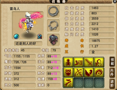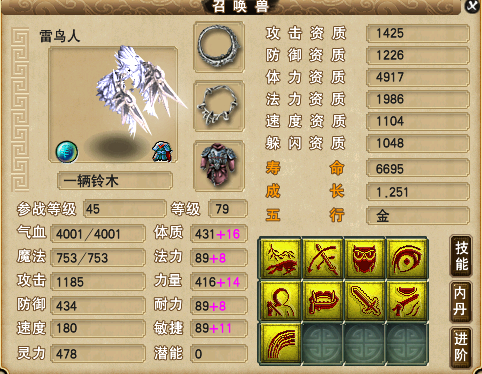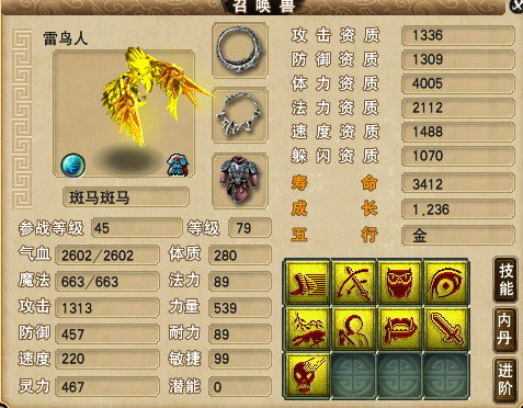 盘点深受喜爱的个性宠:这些够你玩半年!(/16)相关图集: 夜罗刹不要特技直播全红 打到老板泪汪汪(/27)![]() 4技能力劈碧水夜叉,攻资1448,体资4043,成长1.207。资质不错,成长略低,作为一只满级力劈宠,它只拥有4个技能格子,并且气血才2284,高吸血就显得有些鸡肋了,不如换成夜战或者高神,这样实用性更高。不知道少侠们有没有见过进阶碧水夜叉的攻击动作,它一斧子砍下去,很配力劈这个技能。 ![]() 4技能须弥般若天女,体资5408,法资2491,成长1.265。资质和成长都不错,带个高魔心套,四个高级法术输出技能就全了,虽然它没有一点生存能力,PK的时候出场不了,但是认为用起来还是非常好用的,并且般若天女的造型也是美美哒! ![]() 5技能法防鬼将,防资1359,体资4970,速资1318,成长1.277。资质和成长不错,技能搭配的也不错,再带个高神套就可以了。在神威组里,鬼将多以攻宠的形式出现,像这种法防鬼将非常罕见,PK的时候拉出来,起法防之前,很有迷惑性。 ![]() 最后来看这个7技能狸,体资2916,速资1166,成长1.18,。资质有所欠缺,可以吃元宵养几年,它还没有打书,老板可以考虑把它打成攻宠,要是再贪一点的话,老板可以把它合持国再合一次,至于结果嘛,那就看老板的运气了。