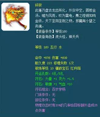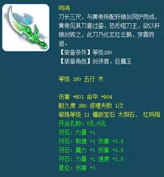 区服:北京1区——生日快乐 卖家:‘坏坏; ID:22948804 售价:500(元) 点评:160级碎寂,10段红玛瑙,总伤901点!大家觉得虎头怪拿锤子的攻击动作帅还是拿斧头的攻击动作帅? 区服:山东5区——玉皇顶 卖家:ペ倚剑戏红颜 ID:44441009 售价:999(元) 点评:160级鸣鸿,11段宝石,总伤902点!今天推荐的都是总伤刚刚超过900的武器,不过只有斧头和锤子便宜一点,刀和杀破狼用的武器的价格都比较高,大家选择角色的时候也要考虑到各个职业的装备价格哦~