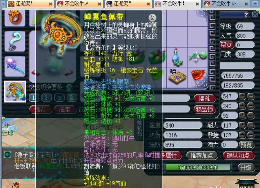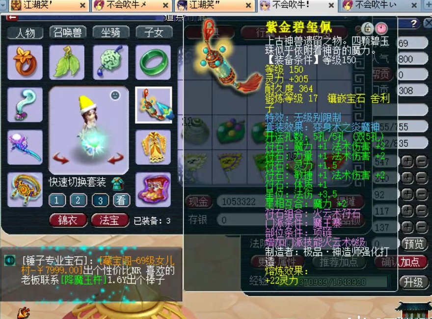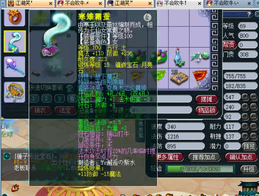 大家都知道现在的梦幻中有很多知名玩家,比如精锐的公瑾,勇武的大炮,神威的萌大奶,吴独秀,王谢,天科的无霜,天启的三雾等等等。 他们都是各个等级中的顶尖玩家,天元中的顶尖玩家更多了,紫禁城的爆总,珍宝阁的涛哥,钓鱼岛的醉奶,姑苏城的文哥,还有齐云楼的念总! 今天的主角就是武神坛服战知名老板念总的精锐法系号。当时齐云楼服战队解散之后,念总就将自己的一部分重心放在了69级,今天就给大家展示一下念总价值百万的精锐法系! 69级魔王寨,气血10434,防御1292,法伤1216,这个面板得碾压多少精锐法系啊?“不会吹牛!”这个名字也是念总最喜欢的名字之一。 ![]() 15段黑宝石的无级别鞋子,防御+95,敏捷+47,变身术之炎魔神,鞋子属性还是蛮不错的。 ![]() 17段舍利子的无级别项链,总灵力327,初灵225,变身术之炎魔神。 ![]() 16段舍利子的无级别法系女衣,单加魔力35,初防281,变身术之炎魔神。 ![]() 15段月亮石的无级别放下屠刀女头,初防67,变身术之炎魔神。 ![]() 16段光芒石的常规无级别腰带,防御+95,气血+996,差一点点就可以达到千血了。 ![]() 16段太阳石的魔耐双加59的无级别武器,造型好看,双加暴力,伤害也高,顶级无级别法系神器。 8段星辉石的超级简易双防御双抗封的手镯,8段星辉石的双抗封一防御的佩饰,均为7级心无旁骛。 6段星辉石的双法伤一法爆戒指,跟6段星辉石的双法伤双法爆耳饰,均为7级心无旁骛。 念总的灵饰还是非常强的,这一套灵饰别说日常天地了,就算是去打pk也足够了! ![]() 9技能须弥高级遗志雷鸟人。 ![]() 9技能高资质净台雷鸟人,防御资质1406,成长1.233。 ![]() 12技能高资质壁垒雷鸟人,攻击资质1479,防资1410,成长1.289。 小编真心觉得念总这个法系号绝对可以去打联赛了,用这样的号刷日常天地真的不浪费么?真的是太奢侈了,小编我酸了,不知道你们酸么? 叶子猪梦幻西游玩家群:1群 325703083 (2000人),2群: 330102322 (千人);3群: 424986787 (游戏疑难解答);4群: 330518295 (商人物价);5群: 1063086037 (疑难解答);6群: 1045753197 (春心萌动);7群: 787195090 (活跃互动);8群: 720665628 (全民PK) [编辑:小麦]