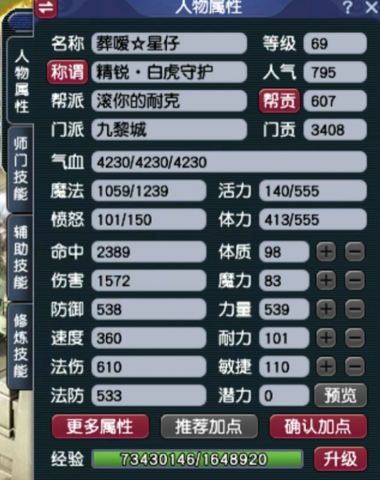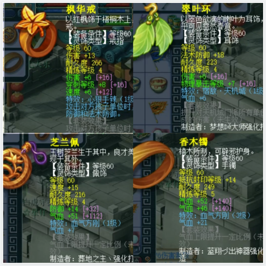 对于69级的小伙伴来说,只需要较低的花费就能通刷一切任务。这不,今天就有位建号不到一年的九黎玩家,晒出了一个“简易武器搭配三件套”的配装策略。下面,就给大家展示一下吧! 一、人物装备展示 左手武器部分为70级纯伤422的简易、修罗咒,镶嵌了7锻红玛瑙,属性非常不错。 右手武器部分为70级纯伤399.6,单加21耐的简易,镶嵌了7锻红玛瑙,伤害还算可以。 发簪部分为60级夜罗刹,镶嵌了6锻红玛瑙,任务用它没毛病。 腰带位置为60级夜罗刹,镶嵌了6锻光芒石,性价比非常高。 项链位置为60级总灵92的夜罗刹,算是一件颇为不错的凑套装备。 鞋子位置为70级简易,镶嵌了5锻黑宝石,有提升速度的作用。 二、灵饰展示 该玩家前排灵饰为3伤害、1穿刺、1 速度、1物暴,后排灵饰为3气血、1防御。这套配置不仅能提升面板伤害,还能起到增强抗性的作用。 三、召唤兽展示 第一只召唤兽为6技能全红感知须弥,任务用它嘎嘎猛。 第二只召唤兽为7技能血攻高连,任务用它毫无压力。 小结 总的来说,这个精锐九黎城在有临时的情况下,拥有4230点气血、1572点伤害、538点防御和360点速度。单就属性来说,已经可以通刷一切常规任务了。不知道各位小伙伴觉得,这个号的配置能打几分呢? 叶子猪梦幻西游玩家群:1群 325703083 (2000人),2群: 330102322 (千人);3群: 424986787 (游戏疑难解答);4群: 330518295 (商人物价);5群: 1063086037 (疑难解答);6群: 1045753197 (春心萌动);7群: 787195090 (活跃互动);8群: 720665628 (全民PK)
