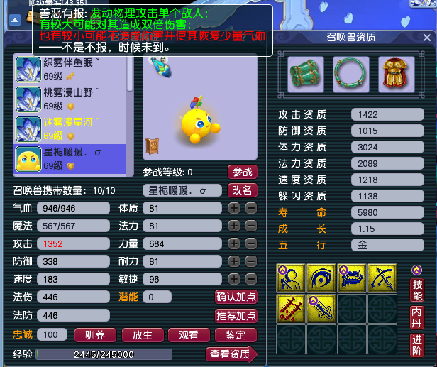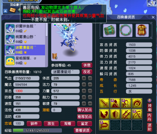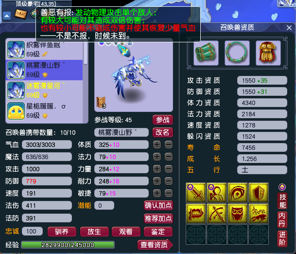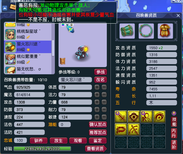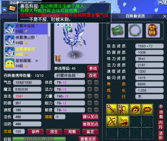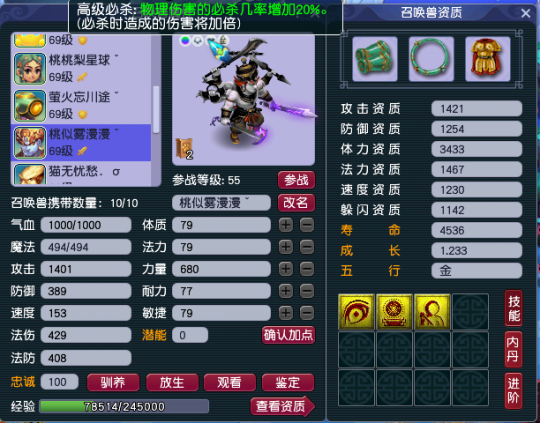 对于59级的小伙伴来说,九黎城算是一个输出能力极强的“机制怪”。只要给创造出有利的输出环境,就有终结比赛的可能。这不,今天就有位玩家晒出了一个输出高、抗性足的59级一线九黎城。下面,就给大家展示一下吧! 一、人物装备展示 左手武器部分为100级纯伤518,单加24耐力的无级别、金刚护法,镶嵌了11锻太阳石,属性非常不错。 右手武器部分为100级纯伤520.3,单加27力量的无级别、金刚护法,镶嵌了11锻伤害宝石,性价比非常高。 发簪部分为70级无级别、金刚护法,镶嵌了11锻伤害宝石,有增加输出的作用。 腰带位置共有三条,第一条为70级无级别、夜罗刹,镶嵌了12锻光芒石,有增加血量的作用;第二条为60级简易、愤怒、夜罗刹,PK用它非常舒服;第三条为80级无级别、勠力一击,镶嵌了11锻光芒石,实用性非常强。 项链位置也有两条,一条为60级总灵108的破血、简易、夜罗刹,算是一件颇为不错的PK装;一条为60级总灵128的简易、太极护法、勠力一击,PK用它没毛病。 鞋子位置也有两件,第一件为60级简易、野兽、夜罗刹,镶嵌了6锻黑宝石;第二双为60级冰清、无级别、勠力一击,镶嵌了9锻黑宝石,单挑用它非常舒服。 二、召唤兽展示 第一只召唤兽为6技能全力高连,攻击力高达1541点。 第二只召唤兽为8技能耐攻高连,攻防双资均在1550以上。 第三只召唤兽为9技能四赐福超否高连,平时可以拿来刷天地。 第四只召唤兽为6技能蓝书泡泡,任务用它非常不错。 第五只召唤兽为5技能须弥,输出能力嘎嘎猛。 第六只召唤兽为6技能天机城,属于既能输出,又能看血的存在。 第七只召唤兽为3技能善恶地狱战神,攻击力高达1401点。 第八只召唤兽为5技能4赐福卡速,单挑非常好用。 第九只召唤兽为4技能龟速超否,体力资质和防御资质均达到了上限。 三、小结 总的来说,这个59级的九黎城在耐属性情况下,拥有5253点气血、1477点伤害、968点防御和315点速度;在全力属性情况下,拥有3524点气血、1773点伤害、592点伤害和315点速度。单就属性来说,在没有灵饰、玉魄系统的情况下能达到这个属性,在59级玩家中属于一线级别的存在。不知道各位小伙伴觉得,这个号的配置能打几分呢? 叶子猪梦幻西游玩家群:1群 325703083 (2000人),2群: 330102322 (千人);3群: 424986787 (游戏疑难解答);4群: 330518295 (商人物价);5群: 1063086037 (疑难解答);6群: 1045753197 (春心萌动);7群: 787195090 (活跃互动);8群: 720665628 (全民PK)