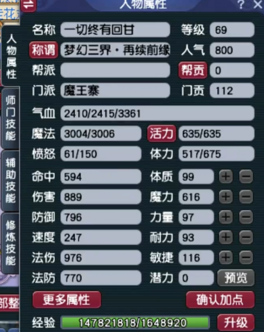 对于69级玩家来说,现在最火的平明大区莫过于【姑苏城】。这不,今天就有位小伙伴豪掷1.9W,拿下了一个有无级别、配置齐全的高法爆魔王。下面,就给大家展示一下吧! 一、人物装备展示 武器部分第一把为100级纯伤531的无级别,镶嵌了10锻太阳石,有增加法伤的作用。 衣服部分为60级总防108,单加14魔力的葫芦宝贝,任务用它没毛病。 头盔部分为70级简易、凝滞、葫芦宝贝,镶嵌了7锻月亮石,有提升抗性的作用。 腰带位置为70级愤怒、简易、葫芦宝贝,镶嵌了7锻黑宝石,性价比非常高。 项链位置为70级总灵170的无级别、葫芦宝贝,镶嵌了10锻舍利子,属性非常给力。 鞋子位置为60级琴音三叠、葫芦宝贝,镶嵌了6锻黑宝石。 二、灵饰部分及细节展示 该玩家前排灵饰为4法伤、3法暴,后排灵饰为2气血、4防御。这套配置不仅能提升面板法伤和法暴几率,还能起到增强抗性的作用。 角色修炼方面三修全满,召唤兽修炼全满。 辅助技能方面强身满,强壮、神速均以达到24。 祥瑞方面只有寒冰灵虎和开天明兽。 典藏锦衣方面有染色水云归,颜值还算不错。 三、召唤兽展示 第一只召唤兽为7技能血攻高连,输出能力非常不错。 第二只召唤兽为5技能全红须弥,平时用它刷任务确实没毛病。 第三只召唤兽耐攻感知壁垒,可以用来杀天地、刷归墟。 第四只召唤兽为5技能卡速血宠,只要用来顶药。 小结 总的来说,这个魔王寨在没有临时的情况下,拥有3361点气血、796点防御、247点速度和976点法伤。单就属性来说,平时刷任务确实没太大问题。不知道各位小伙伴觉得,这个角色买的值么? 叶子猪梦幻西游玩家群:1群 325703083 (2000人),2群: 330102322 (千人);3群: 424986787 (游戏疑难解答);4群: 330518295 (商人物价);5群: 1063086037 (疑难解答);6群: 1045753197 (春心萌动);7群: 787195090 (活跃互动);8群: 720665628 (全民PK)