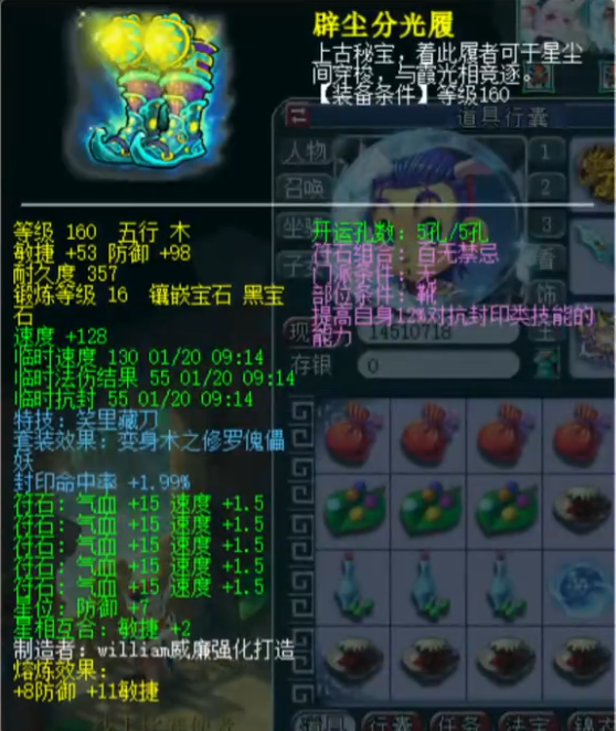 在梦幻西游第234届武神坛赛事中,【紫禁城】全员同心协力,一路过关斩将,最终于决赛将最强黑马【苏堤春晓】拉下神坛,成功夺得2026开年首冠! 赛后,风少特邀旭旭宝宝一同参与封印蚩尤。宝哥也借此机会,为广大玩家展示了时间服第一五庄的部分顶级硬件。接下来,就让小生带大家一起领略王者的风采。 一、属性展示 风少五庄观带战神山的PK属性,具备14706点气血、2932点防御、1670点速度和2533法防。 二、装备展示 160级耐敏双加62的神佑罗汉枪(原造型法杖),16锻太阳石伤害642。这把武器具备保命特效,能在决胜时刻起到关键作用;罗汉大特技更是让全体单位增加三回合BUFF,堪称法系克星。 160级不磨诅咒带1.92%封印的项链,16锻舍利子+熔炼总灵352。诅咒之伤是一个单体扣血的特技,适合一速定位,可以配合队伍完成各种点杀战术。 160级笑里带1.99%封印的鞋子,熔炼后敏捷64、防御106。五庄有时候作为单封体系,为了夺得优势需要争一速,高封印蓝字配合笑里特技可以把对手的愤怒值控制得“死死的”。就属性来说,这就是全服第一封印笑里鞋。 160级晶清带1.9%封印的头盔,镶嵌16锻月亮石+熔炼总防299。晶清能在关键时刻全体解封并缓解血线压力,加上接近极限的封印蓝字,算是全服孤品级封印晶清神装。 160级慈航男衣,熔炼后防御303、加57敏。属性极其优秀,慈航可复活全体倒地队友,配合龟速宠喝酒战术,打对手一个措手不及。 160级愤怒放下带1.13%封印的腰带,熔炼后气血404、防御104。不仅能克制对手物理系,还能提升日月乾坤命中率,这是无数封系的“梦中情腰”,也是现役全服第一服战腰带! 三、灵饰&玉魄展示 前排灵饰选用六速度。耳饰上排法防28国标,下排速度共45为极限属性,这就是全服第1三速度耳饰;戒指上排防御28国标,下排速度共42爆12。 后排灵饰选用六法防。佩饰速度30极限属性,下排三法防共110爆26;手镯抗封35爆7,下排三法防共113爆29。 灵饰套装是8级163特性,能够强化PK中的站场能力。 前排玉魄是三速度带1.2%奇袭法术几率,后排玉魄是双法防一防御带2.5%奇袭法术几率,分别镶嵌14、12级五色灵尘。不仅基础属性拉满,更有3.7%奇袭蓝字,每当触发一次奇袭技能,都能为对手制造麻烦。 四、召唤兽展示 11技能四轮攻谛听,不仅携带千亿兽诀神马,更有超级必杀,可概率触发3~4倍伤害,提升清场能力。 11技能须弥法谛听,不仅8轮在手,还有超级法暴技能,全魔加点输出天翻地覆! 8技能全红攻谛听,全敏加点用于清宠。 10技能三特殊涂山瞳,2230法伤用来收割人头。 以上便是风少五庄观的主要硬件展示。在大家看来,他是否有实力登顶全服第一五庄观的宝座呢? 叶子猪梦幻西游玩家群:1群 325703083 (2000人),2群: 330102322 (千人);3群: 424986787 (游戏疑难解答);4群: 330518295 (商人物价);5群: 1063086037 (疑难解答);6群: 1045753197 (春心萌动);7群: 787195090 (活跃互动);8群: 720665628 (全民PK) [编辑:百晓生]