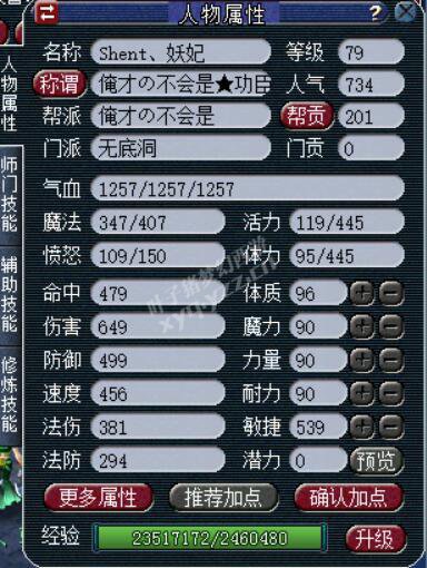 想来想去还是梦幻西游好玩,新组合五开走起! 目前等级的队伍图镇楼,给大家说说这个组合的优势,优势就是版本优势 ,哪天策划不开心,来一刀,这组合也就变弟弟了,乘着刚改赶紧练组玩玩。 加点的话我加的有问题,应该加100体的,现在我抓鬼遇到龙宫的马面就是一把团灭。 先说说我目前的想法大致的说下 升89然后刷够了再升109 怎么算刷够 我想的是 技能满然后升100的装备收齐 宝宝看经济情况来配 我之前的话是卡得60级 然后70级 目前79 装备用的还是60的时候的装备 等89的直接换80级装备 对于装备的话 我大概的要求是: 80级头 防御大于50 80级项链 灵力大于120 80级武器 伤害大于270 有双加 而且必须带敏捷 另一个 体耐无所谓 80级衣服 双加 而且必须带敏捷 另一个 体耐无所谓 衣服是最难收的 防御多少都可以 或者初防高点单加敏捷也可以 80级腰带 初血大于250 80级鞋子 初敏 40 40是系统产的80鞋子的极限 这个和衣服一样难受 这个不凑合 因为我现在带的60鞋子敏捷都是30+的 不是40的没必要换 下周应该能把装备收起来 鞋子和女衣可以不急 其他装备收完了 完事大概充500块点卡吧 打打宝石 点点技能 有钱就多补补修