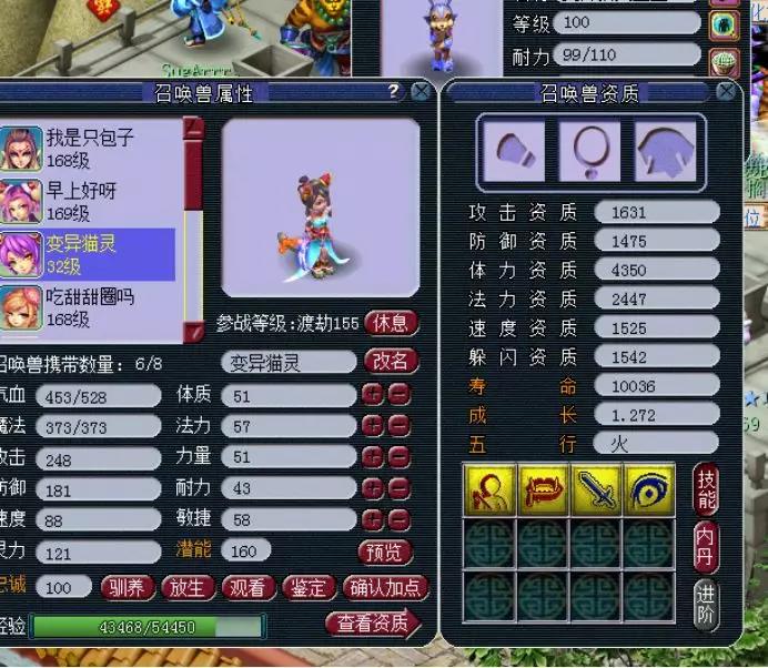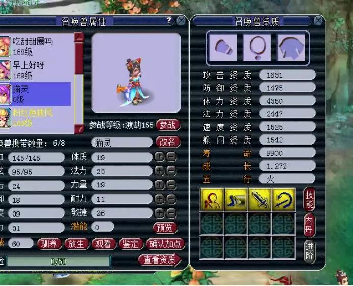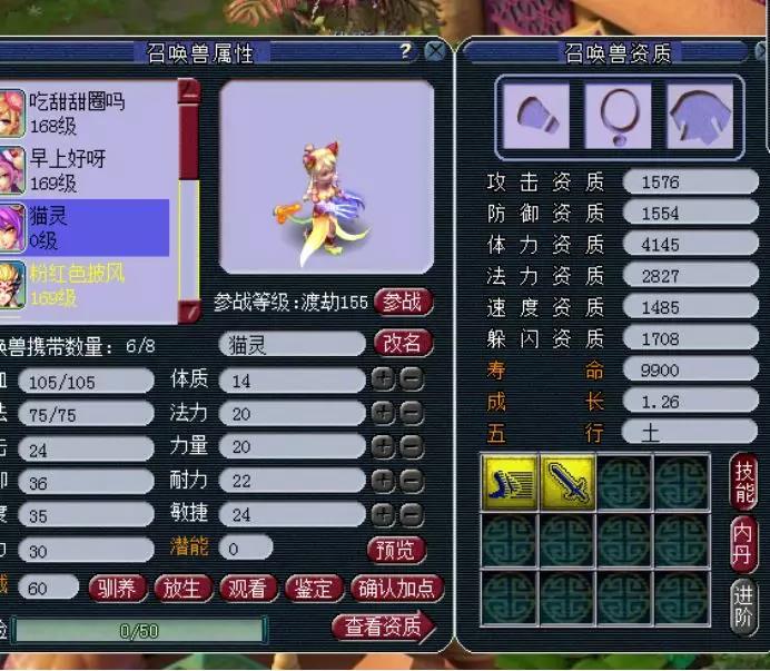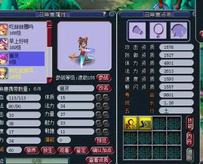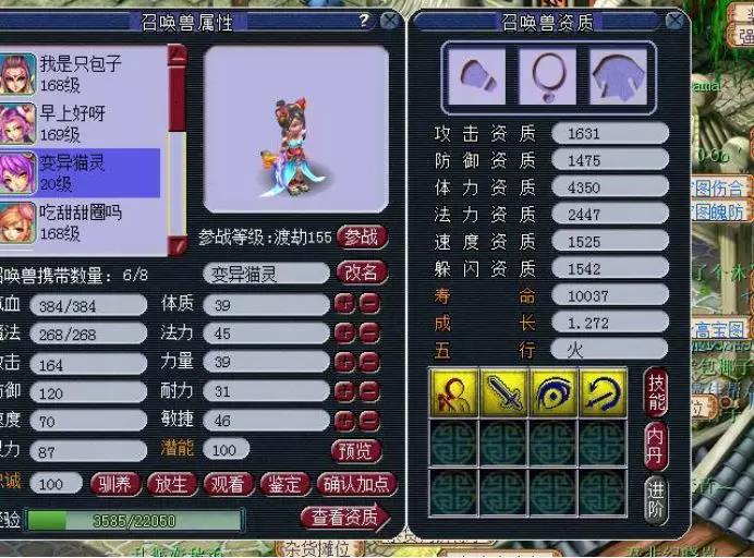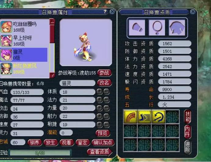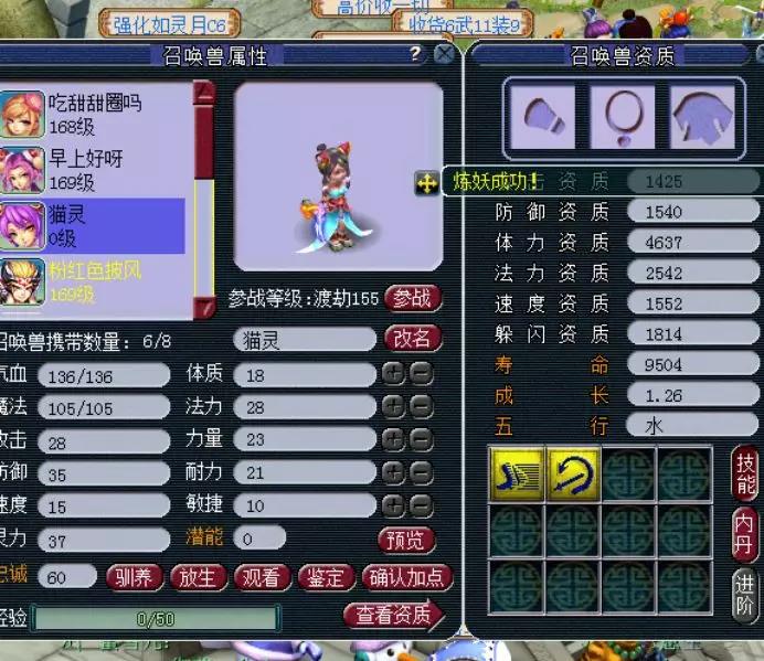 在天启这个等级里,最常见的宝宝就是豹子了,和豹子资质相当的就是人形的猫灵了,但是豹子的技能总归是比猫灵多,所以真正在比武pk中最常见的都是豹子,猫灵少之又少,但还是有很多喜欢美丽外表的妹子。 尤其是变异猫灵,只要技能数多一点,还是很有市场的。这不,今天就有玩家想要洗出一只满技能的变异猫灵,不知道如愿了没有? 这就是我们玩家准备的变异猫灵,可惜资质和技能,太寒碜了。 玩家超级净瓶玉露准备不少,一起来看看吧~ 5次一看,资质不错,技能太少。 再5次,洗出了不同颜色的变异猫灵,貌似这个更好看。 第20次,感觉又回到原来的样子了。 第30次,颜色好看,资质可以,可惜技能数少了,继续~ 这时候玩家表示等一下!1631的攻资,爆了!而且4技能也不少,玩家不纠结满技能,这一只够用了。 玩家对比一下,全吃体力元宵,体资也是够用了。 既然决定了,玩家就开始上书第一本,夜战,顶掉辅助技能飞行,很好! 第二本高吸血来了。 高吸血掉反击,完美!带个高连套或者高神套,技能完美,而且寿命还吃到了1W以上。 玩家自己说了,成本6500W梦幻币,如果只卖成本价,相信还是很多玩家会争先恐后地抢吧? 叶子猪梦幻西游玩家群:1群 325703083 (2000人),2群: 330102322 (千人);3群: 424986787 (游戏疑难解答);4群: 330518295 (商人物价);5群: 1063086037 (疑难解答);6群: 1045753197 (春心萌动);7群: 787195090 (活跃互动);8群: 720665628 (全民PK) [编辑:夏大雨]