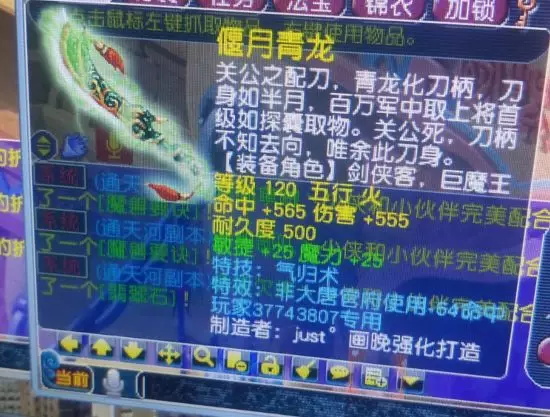 120高伤武器来袭!一把120级属性好的武器简直屈指可数下面这位玩家打出的这把120级的偃月青龙命中+565,伤害+555不算属性总伤已经高达840+还有敏魔双加50是一把神器无疑了!看到专用几个大字小美又邪恶了这肯定是位69级的玩家吧!哈哈,坏蛋小美上线了……