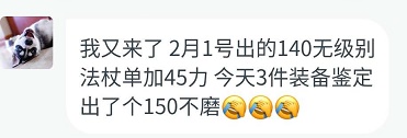 在2月1日时,这位粉丝逆袭了一件140级单加超高的无级别法杖,45力量。体验到了逆袭的快乐后,又准备了1亿游戏币去鉴定装备。上次逆袭了140的无级别法杖,这次他想出个150的无级别棒子。