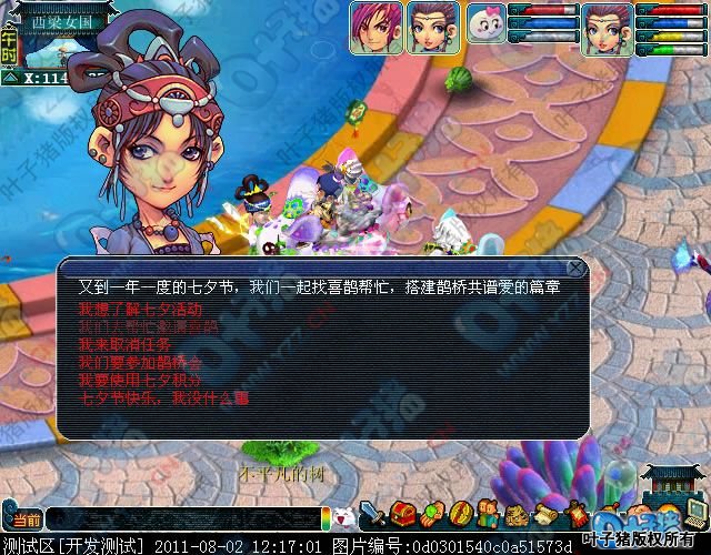 七夕任务测试,挖羽毛活动、回答问题、鹊桥的搭建,前两个是双人任务,后面一个是多人任务,记得组队要有不同性别在里面哦,经验不错,任务难度不大。