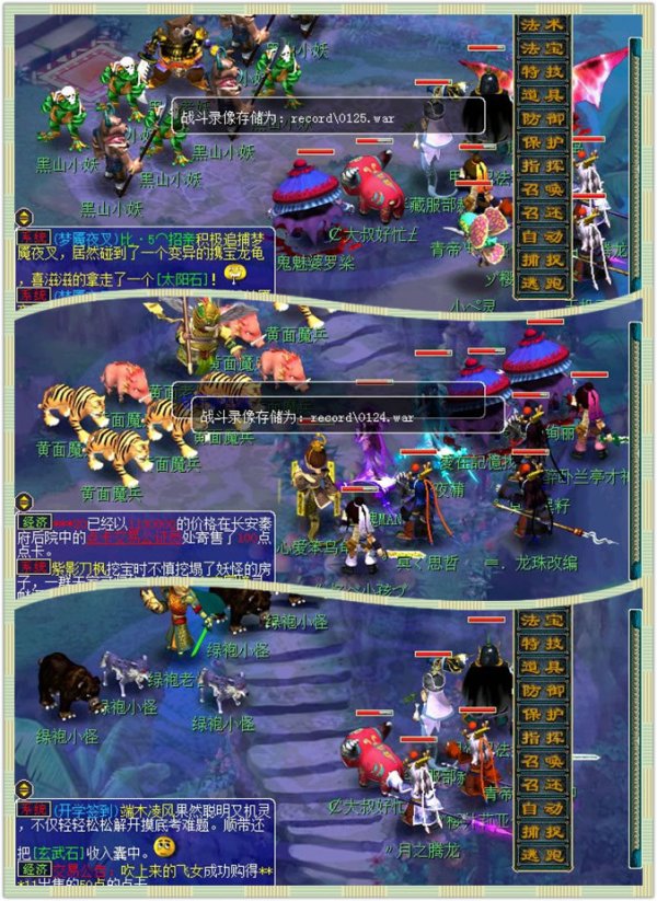 第二环【杀妖军】 任务目标:【需组队】消灭所有入侵花果山的怪物,一共有3只,本环节任务时间:15分 怪物一共有3种类型,即黑山老妖、黄面老魔,绿袍老怪,整体难度较低,小怪普遍带有反震 黑山老妖:主怪STL。血量5000左右,不抗,小怪怕法 绿袍老者:主怪ES,血量5000左右,抗物理,黑熊,狼多为NV门派,较抗法 黄面老魔:主怪STL,血量5000左右,不抗,老虎多为法系门派,怕法 点评:怪物血量普遍不高,难度颇底,且小怪一般为法系或封系,伤害输出不高 录像: 杀完3只怪物,系统刷出混世妖将