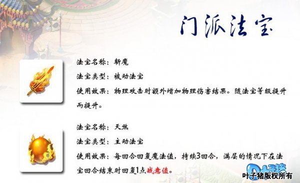 门派法宝:斩魔、天煞 1、斩魔:物理攻击时额外增加物理伤害结果。随法宝等级提升而提升。 2、天煞:每回合回复魔法值,持续3回合,满层的情况下在法宝回合结束时回复1点战意值。 |