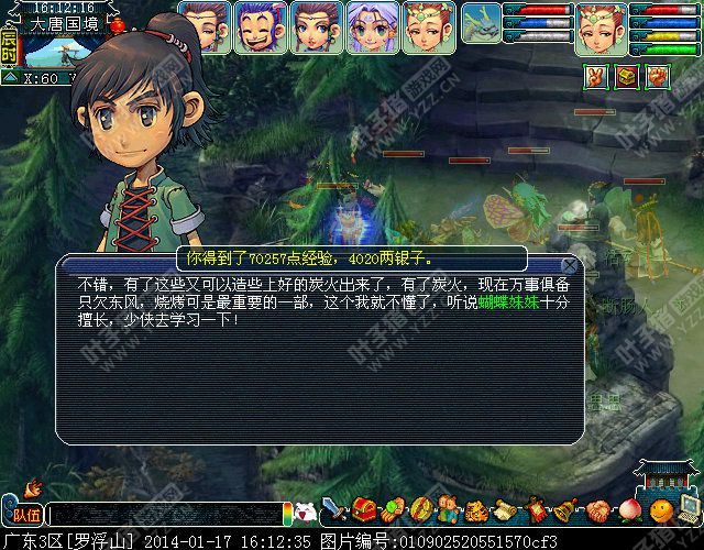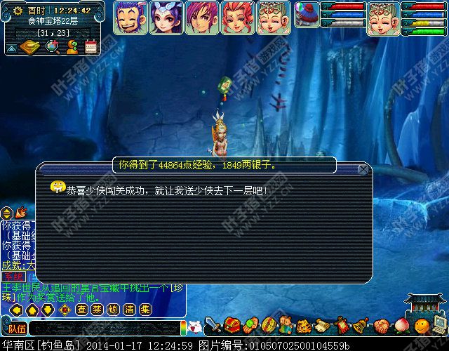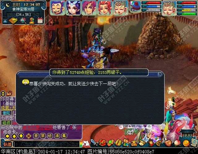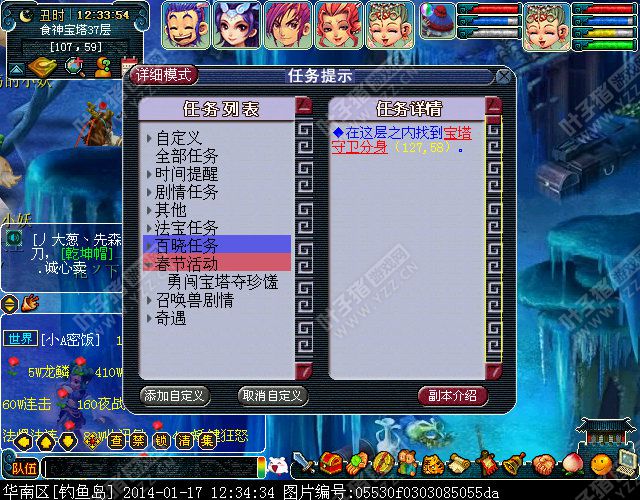 勇闯宝塔夺珍馐 推荐指数:★★★★★ 活动时间: 2014年1月24日-2014年2月11日春节活动期间每天12:00,19:00和21:00举办三场,每场持续时间60分钟。 活动介绍: 活动期间,等级≥30级,组队人数≥3人的玩家可于长安城(228,107)的新春大厨处进入美食宝塔,开始闯关爬塔,完成每一层的宝塔守卫的要求,即可通过宝塔守卫传送进入更高的一层,闯塔期间还能获得各种各样的神秘符文,可保护自己的队伍,或让别人的队伍下降层数,当到达宝塔的第九十九层后,还可以突破最高层,挑战突破层数的宝塔守卫!爬的宝塔层数越高,奖励则越丰厚,活动结束时处于食神宝塔最高层数的十支队伍,则能登上爬塔排行榜,领取额外奖励! 这个因为是99层的,所以图片比较多,小编先把结论写在前头,然后大家想看详细的再点后面查看。 109级平民队伍52分钟闯57关,经验奖励207W9770点,金钱8W3262,物品就小编自己只得了个1J舍利子。(注:109一小时五门派抓鬼大概130W+经验、30W+金钱) 闯关途中就系统刷出的奖励多为强化石、宝石,名次前三的队伍可获得的奖励为五宝、摇钱树苗、玉露、超玉露、兽决。 详情见后文。推荐缺经验以及喜欢闯关类的玩家必做。 任务类型有猜拳(一招定胜负,失败可重复)、战斗、找人、答题(题目多是师徒任务类型的问题)、辨认物品、; 有一定几率获得特殊道具:风神符、停滞符、无敌符、下落符,所有成员都有几率获得。 风神符可直接使用,效果为上升几层或下降几层,看人品,一人每场活动最多使用10次。 停滞符AIT+G给予其他队伍成员,效果为使得其队伍15秒内停留在原地。 下落符顾名思义,使得对方下落几层,这个小编没得到过,就不误导大家了。 无敌符自己使用,使用后1分钟内免疫停滞符与下落符负面影响。 部分重复场景挑战怪坐标 TT场景(66.34,即中间)或70.52,基本上就这两个坐标。 其他场景,如凤巢、龙窟因为涉及到不同层数,所以坐标就不一一列出了,大家看详文可以看到。 降低层数后重新登上还是有奖励的。 测试队伍:109级 猜拳。