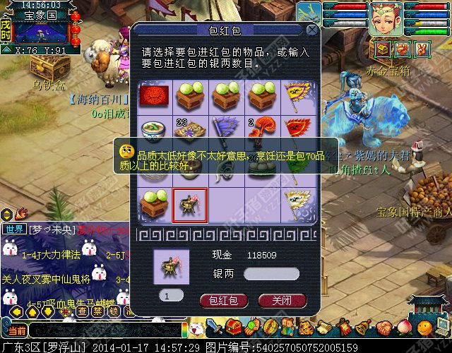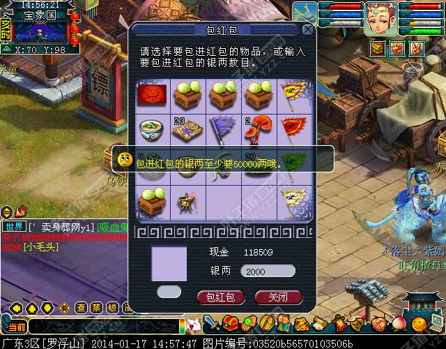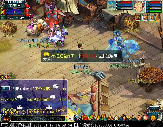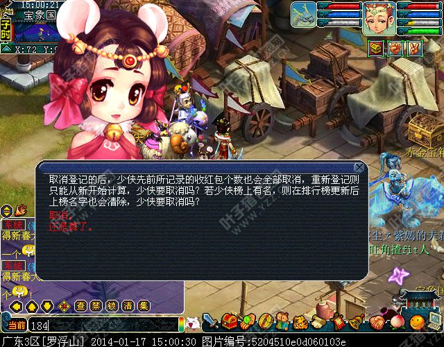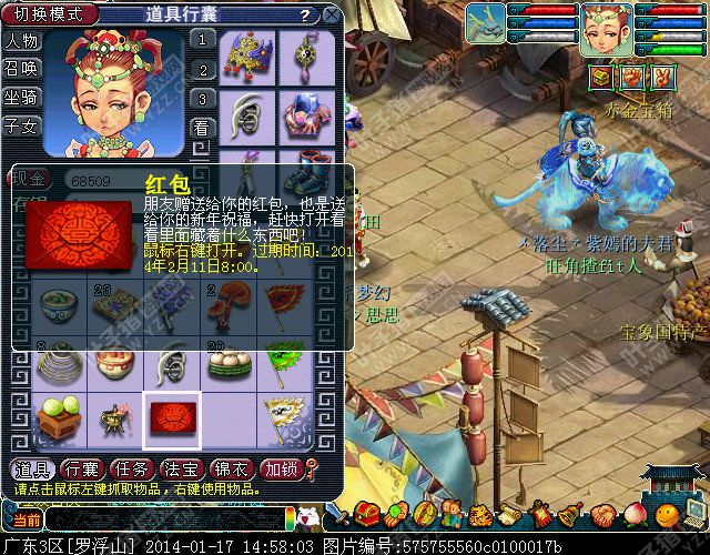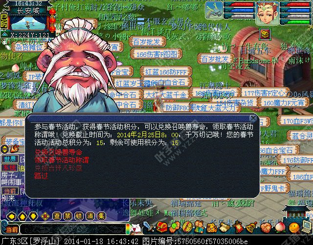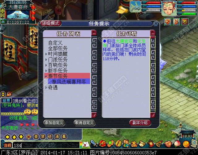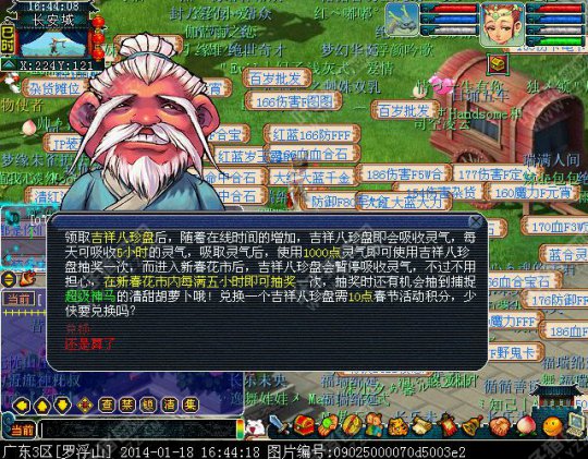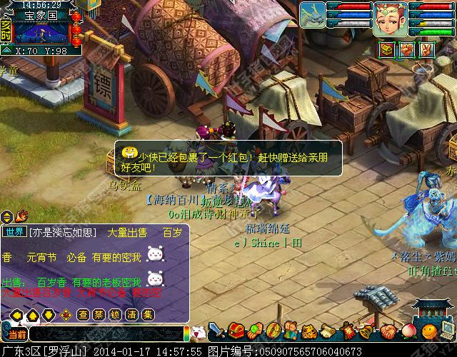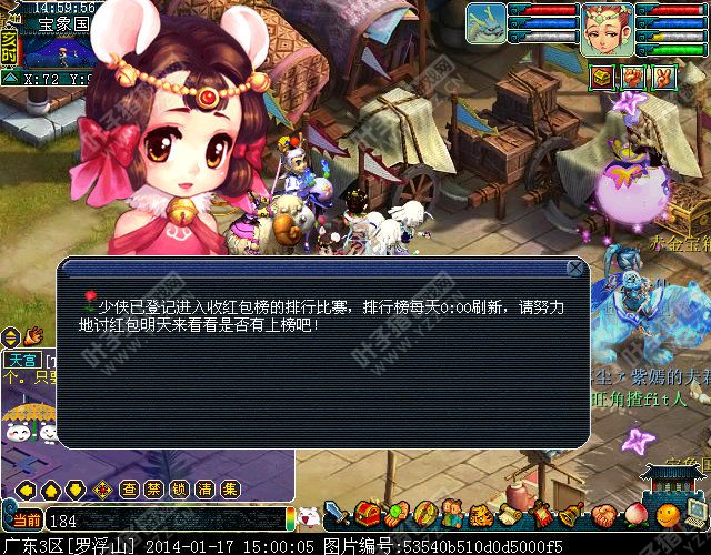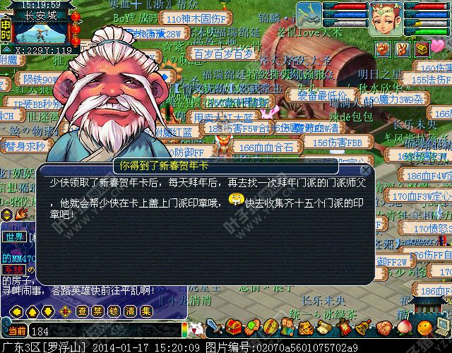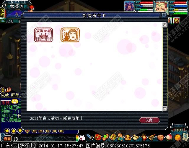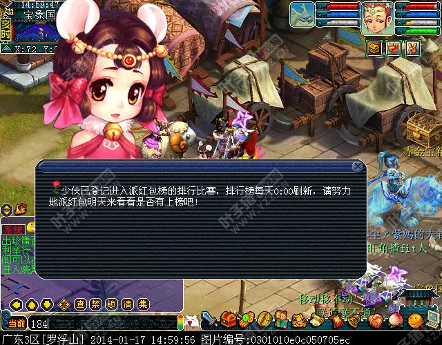 互赠红包传祝福 推荐指数:★★★ 活动时间: 2014年1月24日-2014年2月11日春节活动期间每天。 活动介绍: 活动期间,在宝象国(71,96)财神童子处可以将银两以及部分物品包成“红包”,赠送给其他少侠,还可以在财神童子处登记排行榜,参与派红包与收红包的比赛,每天收派红包数量最多的前五名少侠可登上排行榜,领取特别称谓! 少侠们也可花费一定体力在财神童子处包出“贺喜红包”赠送给朋友,收赠双方都能获得奖励!参加春节各个活动中,还有机会获得 “祝福红包”,传递祝福红包即能获得奖励,传递给数名玩家后打开祝福红包,参与传递的少侠都能获得“年糕”,集齐一定数量的年糕即可宝象国(71,96)财神童子处兑换奖品!并且收赠贺喜红包以及祝福红包达到一定数量亦能获得特别称谓! 测试号69级,小编目前只能为大家展示下流程,用体力做红包是要消耗15点的。包金钱的话至少要5W,包烹饪要70品质以上的,其他物品暂时未知。做好的红包自己也可以打开,有点不同的就是,有个祝语,而且有成就进度。部分物品无法包起,如摄妖香。 梦幻精灵描述 春风送暖喜拜年 推荐指数:★★★★ 活动时间: 2014年1月24日-2014年2月11日春节活动期间每天。 活动介绍: 活动期间,在长安城(228,107)的新春大厨处领取拜年任务,每天可以给两个门派拜年,拜年需找到门派上下全部的NPC,每位NPC都会给予少侠一个任务,完成之后即可获得丰厚奖励。 少侠还可以在长安城(228,107)的新春大厨处领取活动道具“新春贺年卡”,完成一个门派的拜年任务后,即可找该门派的师父盖上门派的印章,盖满15门派的印章后,可带着新春贺年卡找新春大厨领取特别奖励哦! 测试号:69J,因为每个门派NPC个数都是不同的,所以这里的奖励与耗时仅供参考,所得经验26W7395点,金钱25664,耗时7分钟。 领取任务 要去找遍2个门派场景内所有的NPC...