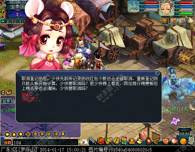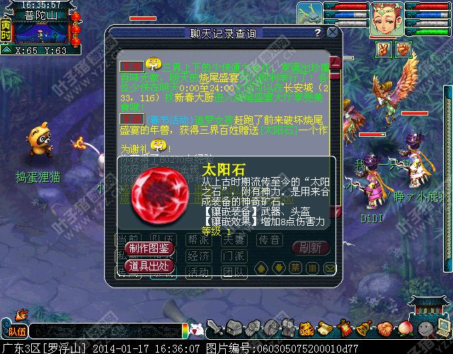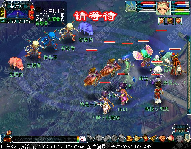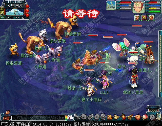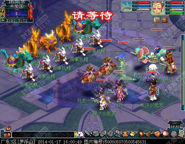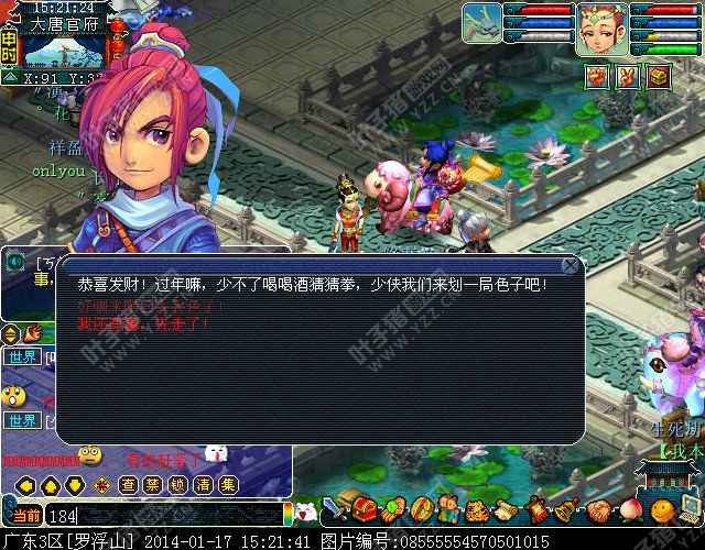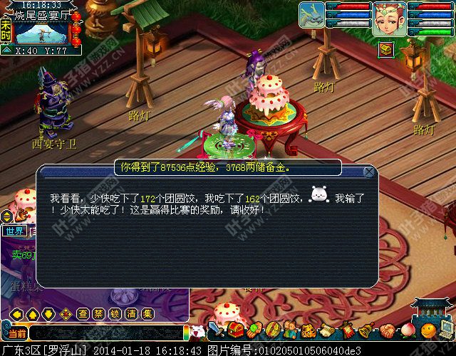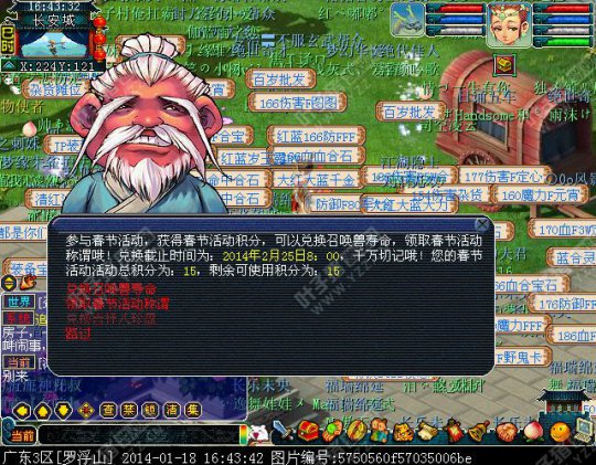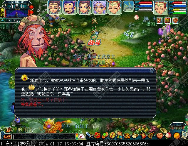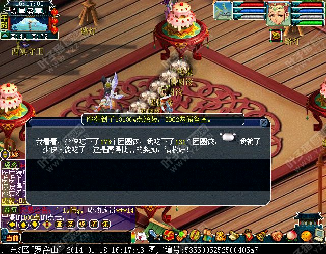 百艺争鸣花市乐 推荐指数:★★★★ 活动时间: 2014年1月24日-2014年2月11日春节活动期间每天。 活动介绍: 春节活动期间,玩家(≥10级,单人)可于位于长安城(228,107)的新春大厨处进入新春花市游玩,每3钟可获得一次经验奖励。 还可以在新春大厨处领取活动道具“吉祥八珍盘”,带着吉祥八珍盘在新春花市游玩满5小时,即可以使用吉祥八珍盘进行幸运大抽奖一次,既有几率变得精力充沛,可以在新春花市之中多游玩三个小时,还有机会抽中捕捉超级神马的道具清甜胡萝卜哦! 若忙着参与春节活动没有进入新春花市游玩也不要紧,带着吉祥八珍盘参与各种活动,随着在线时间的增加,吉祥八珍盘的灵气也会增加,消耗1000灵气也可以抽奖一次,有机会获得清甜胡萝卜! 测试号:69J,那个吉庆八珍盘小编建议一满10积分立刻就去兑换。要在使用积分那里才能找到这个选项,一般人我不告诉他。 进入挂机场景,每隔三分钟获得1次经验,69挂满5小时大概可获得170W经验,当然,这个性价比不高,高级在里面挂好点。 吉庆八宝糖 活动时间: 春节活动期间,每天8:00-24:00 活动介绍: 春节活动期间,每隔15分钟便会有吉庆八宝糖出现在三界的各个角落。玩家们(等级≤40级)点击吉庆八宝糖品尝,便可以获得丰厚的奖励哦!吉庆八宝糖可能在以下场景与大家见面哦! 烧尾盛宴香万里(多人) 推荐指数:★★★ 以下内容来自官方论坛曼德夫先生的测试,由于这个不是小编实测的,所以具体奖励给不出,不过之前小编杀过三个,队伍里有人拿过金刚,我自己就只拿了宝图,难度较高,杀第三只的时候小编屌丝队伍被团灭。 活动时间:2014年1月24日-2014年2月11日春节活动期间,递交足够数量的四方美食贺新春活动的佳肴后,隔天活动开启。 ①多人挑战类。 多人挑战类,其实就和我们在活动中经常刷的“阵”,需要大于等于三人才能做这个挑战类的活动。 组好自己的队伍后,大家就进入烧尾盛宴香万里的盛宴厅,然后找守卫统领(62,60),领取任务,即驱除东西南北妖魔。 东方向的妖魔找东宴守卫,点击NPC切入战斗。 主怪DT,左右两边也是DT,让老路很惊奇的是,这个也玩点杀,主怪先会点杀队伍一个单位,两个蚌精会跟上补杀。 后排的两个鲛人双抗,对固定伤害门派不免疫。这场老路没有选择技巧性的杀怪方法,直接按照我们以往杀阵的方式杀怪的(boss除外),先是把主怪杀掉,然后再清小的~ 队伍有封系的话就控制下鲛人吧,然后队伍里的辅助注意恢复就好了。 北宴守卫主怪是LG,有高反震,左右四个都是辅助门派,前排有攻也有法的,要杀过去,物理系建议变带有偷袭的变身卡,以免被震死。封系方面,建议封了前面输出的怪,也可以封了后排的辅助,减少他们的血量回复。 西宴守卫,这场战斗大玩点杀,后排的两个BY猿是DT门派,会配合点杀,BY老虎是WZ门派,主怪是HS,会死亡之音,前排可能会有封系辅助物理或者法系等不固定的门派出现。 这场战斗首先把后排的四个变异怪控制住就可以了,当然也要小心前排的,建议大家采用集中点杀的方式来过此战斗,只要打的稳了,就没得问题了~ 四方的妖魔驱除了后,大家找守卫统领(62,60)对话,对话一番周围会出现很多的小怪,大家点了即可,如果很缺经验的话,就可以杀这些小怪吧~难度不是很大,一般1~3回合就可以结束。 当然,如果大家不想杀小怪的话就可以找守卫统领选择“不想驱除了”,接下来会出现BOSS哦~ 讲解下这个BOSS,相当的难。 主怪凌波城,擅长点杀战术。主怪左右四个怪都是法系攻击的门派(但也有可能是物理攻击的门派),而且还会配合主怪点杀控尸。 这个BOSS老路杀了两次,第一次失败了,主要原因是集中点杀后排的四个喽啰,然后却陷入了前排封系怪的怪圈,导致队伍迅速团灭,而且开的天阵,虽然伤害最大化,但是速度却跟不上对面。而且自己也对前排怪疏于防范,没有在意,杀怪方面很失策,没有杀过去。 然后老路改变了策略,开鸟阵,速度领先于对方,先是控制住前排的两个封系怪(蜃气妖,依然是封系,但是门派不固定),然后再集中点杀前排的两个曼珠沙华,然后再把蜃气妖杀掉,最后杀主怪,再解决剩下的怪了,这样老路的策略果然凑效了,我突然发现我好聪明啊。 值得注意的是,怪被封的话,会自动防御或者保护主怪,这样我们的壁垒BB很有用处的哦~主怪两边的怪可能会是物理攻击门派的,会使用破血狂攻点杀我们,完全是配合主怪点杀的,当然还会控尸哦,大家在过这关的时候注意下怎么卡速加血拉人,都要提前计算好,这样才会100%过关。 |