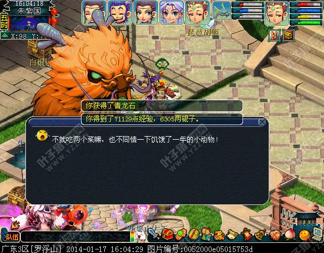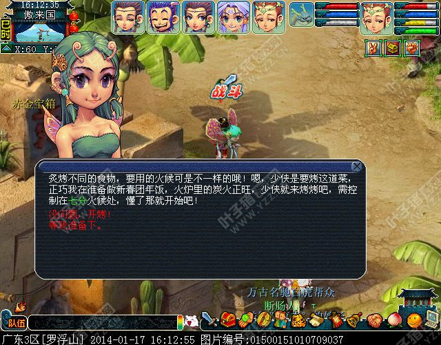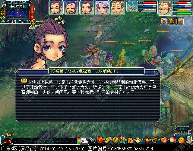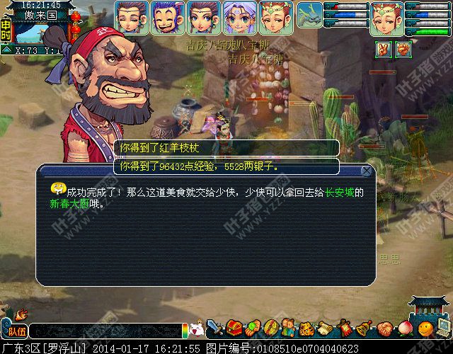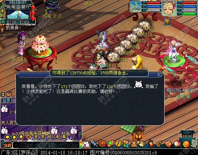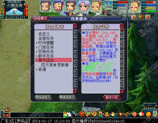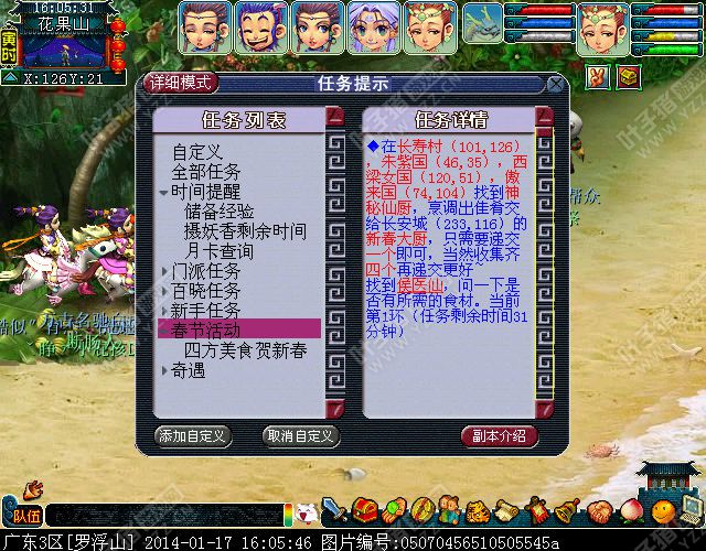 四方美食贺新春 推荐指数:★★★ 活动时间: 2014年1月24日-2014年2月11日 活动介绍: 活动期间,玩家(等级≥30级,队伍≥3人)在位于长安城(233,116)的新春大厨处领取任务,领取任务后,可以分别前往傲来国(74,104)的炙烤仙厨、西梁女国(120,51)的糕点仙厨、朱紫国(46,35)的煎炒仙厨和长寿村(101,126)的蒸炖仙厨完成一轮烹饪任务,少侠们可以自由选择完成任意一个主城的烹饪任务,也可以完成全部主城的烹饪任务。 每一轮的烹饪任务由5个小任务组成,玩家根据系统提示和指引完成任务即可获得丰厚奖励。 总结:69级平民号耗时15分钟左右完成一轮,获得经验38W4659点,金钱22124,5点积分。(注:69抓鬼15分钟大概29W经验,4W金钱左右。) 小编没获得物品,系统刷出的有66、宝石。 到任意指定场景都可以开始环式任务,最后出来的是食物的种类不同。