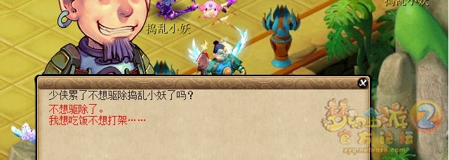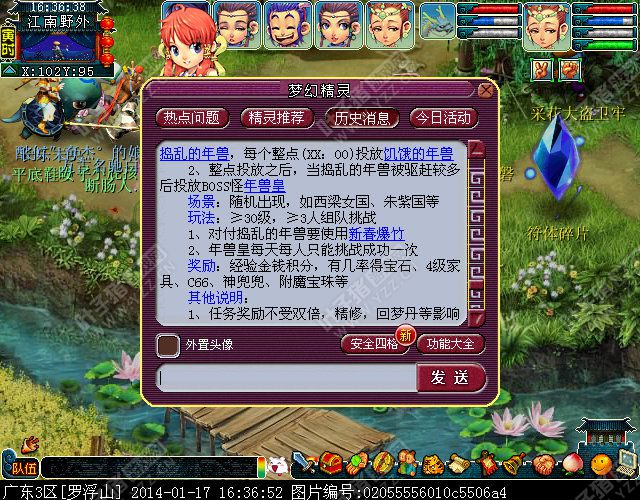 年兽闻香闹春宴 推荐指数:★★★★ 1.捣乱的年兽 活动时间: 2014年1月24日-2014年2月11日春节活动期间每天每个半点。 活动介绍: 春节活动期间的每个半点,西梁女国、朱紫国等地将有可能出现“捣乱的年兽”,玩家根据系统公告的提示前往场景战胜“捣乱的年兽”即可赢得丰厚的奖励。 如果在战斗中使用道具“新春爆竹”,就可轻松赶走它们! 春节活动期间系统每隔15分钟将在各地投放“新春爆竹”,大家根据系统提示前往拾取即可!积极参与其它春节活动,也有机会获得"新春爆竹"哦! 2.饥饿的年兽 活动时间: 2014年1月24日-2014年2月11日春节活动期间每天每个整点。 活动介绍: 春节活动期间的每个整点,西梁女国、朱紫国等地将有可能出现“饥饿的年兽”,玩家根据系统公告的提示前往场景战胜"饥饿的年兽"即可赢得丰厚的奖励。 3.年兽皇 活动时间: 2014年1月24日-2014年2月11日春节活动期间每天每个整点。 活动介绍: 春节活动期间的每个整点,当捣乱的年兽和饥饿的年兽被各位少侠赶走之后,凶恶的年兽皇将会在长寿郊外、花果山等地出现为部下报仇,实力超群的少侠们若战胜了他们,就可以获得丰厚奖励哦! 总结:整点还是不错的,不过杀捣乱的年兽要用到新春爆竹,需要队伍里每个成员都携带还可切入战斗;饥饿的年兽直接战斗。BOSS暂时还没看到,基本奖励,宝石、强化石居多。据梦幻精灵介绍,杀年兽皇有几率得附魔宝珠、神兜兜、4J家具图纸等稀有物品。 测试队伍,69 奖励。