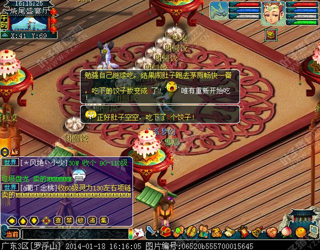 烧尾盛宴香万里(单人) 推荐指数:★★★★ 活动时间: 2014年1月24日-2014年2月11日春节活动期间,递交足够数量的四方美食贺新春活动的佳肴后,隔天活动开启。 活动介绍: 活动分为单人比赛以及挑战任务,若当日的烧尾盛宴有召开,等级≥30级的玩家可以通过位于长安城(228,107)的新春大厨进入“烧尾盛宴厅”参与活动。 1、挑战任务: 玩家(等级≥30级)在位于长安城(228,107)的新春大厨处进入“烧尾盛宴厅”,组成三人或以上的队伍后,可以帮助东宴守卫、西宴守卫、南宴守卫、北宴守卫以及守卫击退来犯的妖魔,在限定时间内赶跑来犯的小妖,最后帮助盛宴的守卫统领击败妖魔的头领之后,就可以享用烧尾盛宴的美味菜式,获取丰厚奖励了! 2、单人比赛 玩家(等级≥30级)在位于长安城(228,107)的新春大厨处进入“烧尾盛宴厅”,找到厅内(42,70)的厨神,即可参加食神比赛,拿上活动道具勺子,点击食神附近的“团圆饺”,即开始比赛,点击一次团圆饺可进食一定数量的饺子,当觉得自己吃够了之后,再和食神对话,就可以知道自己和食神到底谁吃的比较多了哦!参与食神比赛无论输赢均能获得丰厚奖励,当然赢了食神的话,能获得额外奖励,还能领取特别称谓哦! 单人比赛比较简单,测试号为69级,吃了3次获得的奖励为经验34W7570点,储备金1W1498,耗时五分钟内。每天只可进行三次,吃饺子前必须拿勺子,基本保持吃173个就可以战胜这老头了。 点击进入活动场景,到41.62那里去领取个勺子进行活动。 精灵描述。
