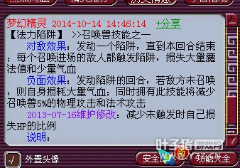 又是一个被遗忘的技能。效果官方已经解释的很明显,从技能定义中可以看出这个技能比较适应高速的加点,神技与鸡肋的一线之差。用得好,对方的宝宝进场都会损失大量的蓝,用不好自己耗损大量气血,看来这个对PK的预判能力需要非常高的一个要求,先来看看,如果对方召唤出来的是善恶、力劈、耐法宝宝,那么这个技能就可以有一个非常好的牵制作用。那么怎么才算好的预判,这个需要大家平时的一些积累了。建议可在对方场上只剩1、2只宝宝的时候使用,前提条件自身的速度一定要保证,否则该技能就没有存在的意义了。 [编辑:夏大雨] |