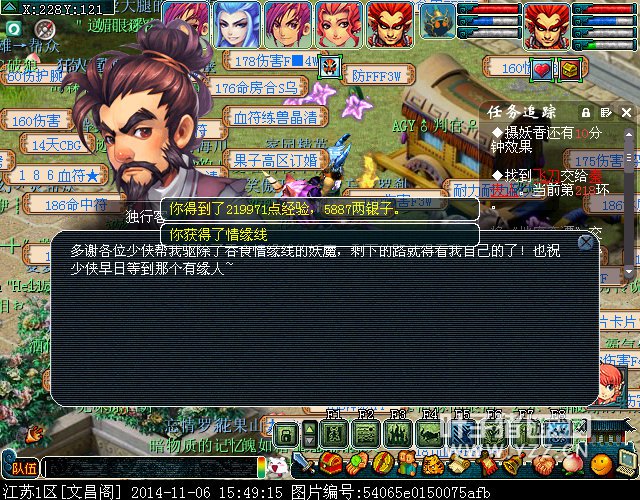下面任务开始! 在CA(230.120)找独行客开始任务,选择“我们来探查失落的情缘线”开始任务! 第一环:让你去找指定的NPC,让你替他找寻烹饪! 等级平均155级来说第一环有11W左右的经验,4000左右的金钱! 第二环:让你去找指定的NPC,找到后选择第一项进入战斗! 怪物双不抗!会破血、弱点、破碎、大法等,输出低。战斗有老朋友“狸”,建议一封系,全输出队即可!安全无压力!战斗结束后有15W左右的经验,4000左右的金钱!得到任务用品“小铲子”! 第三环:点击第二环给的任务用品“小铲子”,会提示你去一个指定的地方使用,使用后进入战斗! 同样,怪物双不抗!会破血、弱点、破碎、大法等,输出低,有狸!战斗结束后获得17W左右的经验、4500左右的金钱! 第四环:提示你去找相应的NPC,找到后会提示你找指定的地方与指定的NPC战斗! 同样无脑暴力碾压过,怪物双不抗!会破血、弱点、破碎、大法等,输出低,有狸!战斗结束后获得18W左右的经验、5000左右的金钱! 第五环:去大唐国境(40.215)找月老,这个是固定坐标! 找到月老后进入战斗,怪物稍稍比前面的提升了一点点抗性,会破血、弱点、破碎、大法等,输出还是很低,挂机4回合妥妥过!战斗结束后获得19W左右的经验、5700左右的金钱! 第六环:战胜月老后,提示要我走回去长安,虽然路程不远,但是走到一半的时候会遇怪! 这是环式任务中,最后一战,千万别被他吓到!怪物和前面的一样,当然还有狸,全环所有的战斗皆可封印!155宝图队5回合碾压过关!不过,战斗结束后是没有奖励的,这时,任务会提示你可以用道具飞回去找独行客了,回去找到独行客后,获得22W左右的经验、6000左右的金钱!并获得情缘线!队长有概率得额外奖励(星辉石、要诀、五宝等)但是小编没有这个人品! 情缘线可以直接右键使用,获得4W左右的经验! 介绍完环式任务,我跟大家介绍下整点任务。 条件≥30级,≥3人组队 一共刷2种! 一种是小怪:窃缘小妖(雷鸟人/蝎子精/鼠先锋造型) 一种是BOSS:噬缘怪分身(修罗傀儡妖造型) 如果逃跑的情缘小妖达到一定数量,则额外触发一波整点怪,每小时最多触发一次! 这个就是小编抓到的小怪!没办法BOSS太猛!抢不到! 可以看到里面有只叫情缘的幽莹娃娃,等下自己会跑的! 对面输出比环式要高,使用各门派技能,血稍多,虽然安全但是太耗时间!战斗结束后获得13W左右的经验、4000左右的金钱!额外获得1.6W左右的经验!性价比不如环式任务,不建议去杀。 值得一说的是许愿树! 利用活动积分兑换树苗,60分/个(每天兑换有数量限制) 种下后有经验金钱、积分,有几率得星辉石、兽决、元灵晶石、灵饰指南书、五宝等。 在国境、西凉、AL、CS郊外、野外均可种植!最后小编给看下单身节的奖励!还是满丰富的。