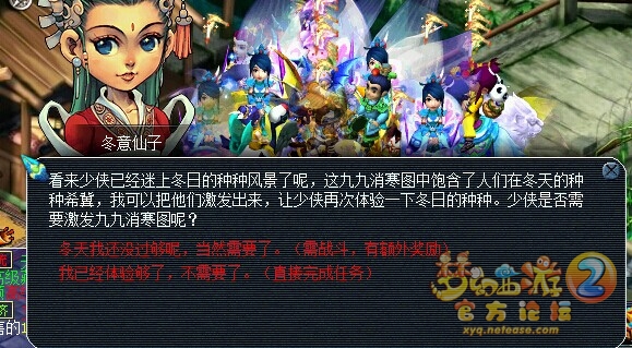 最后把把九九寒梅图交给冬意仙子(194,32),之后冬意仙子给你2个选择,一个是战斗会有额外奖励,一个是不需要战斗,直接完成任务。小记选择了战斗的。 曼珠沙华是狮驼,主会破血,龙龟是化生和普陀,修罗傀儡鬼是各门派混搭。这个任务难度略大,可以考虑带辅助在选择杀,或者带药。