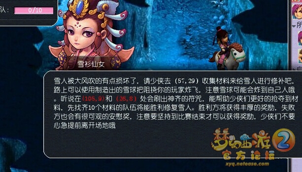 初冬瑞雪生雪趣 活动时间: 报名:12:30-13:00,15:30-16:00,20:00-20:30 参赛:13:00-13:20,16:00-16:20,20:30-20:50 任务要求:等级≥50级,单人参加 玩法介绍:少侠们可以在每天的12:30-13:00,15:30-16:00和20:00-20:30期间在长安城(238,116)雪衫仙女处报名参加堆雪人比赛,帮助雪人花花和雪人木木搜集修补材料。 在活动开启前半小时进行报名,报名成功后在活动期间开启后请立即进入活动场地战斗。活动目标是双方分两队,每队十人进行单人任务为完成一个需要10点礼物(堆积雪人的道具)的雪人。 活动场地内每一分钟会刷出一个礼物在(121,29)二十名玩家进行抢夺拾取,捡到后立即返回出生点的雪人,给予雪人完成堆积。 在礼物刷出前进可能的去用F1(系统给予的一个技能)去炸对方的人,骚扰对方进行拾取,请注意,使用F1原地会出现雪球,大约在2S内爆炸,爆炸小范围对周边所有人,包括队友造成伤害,导致他们立即返回出生地,请拿出你飘逸的走位。另外F1技能领取时间为10S,所以前期不用浪费CD来对对方造成伤害,因为他们还可以走回来,掌握好快刷礼物的时间点,然后炸他们,如果对方拾取了礼物,请在必经之路上围堵对方,用雪球把他炸死,这样礼物会回到你们手上哦。 在交还礼物给雪人的时候会获得经验、金钱,炸伤对方的时候会获得经验。 另外活动中不定时投放buff,位置在左下角或者右下角,有兴趣的朋友可以抢下,这个buff拿了就全队都有效,分2种,一种是可以抵挡一次雪球伤害,另一种是一定时间内F1技能CD变为6秒,都是非常厉害的“法宝”呦。 当一个队伍率先完成10个礼物任务时,活动结束,游戏胜利,另外一队失败,胜利后会获得一定经验、金钱,有几率获得物品,并获得8点活动积分。 |
