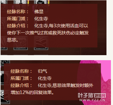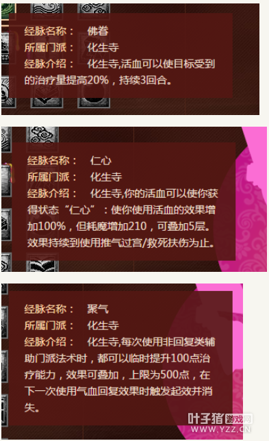 这三个如果我们店了金刚加武器伤害的话,下面这三个就都可以点了,实际这个仁心我觉得有点坑,但是如果自己背点死了那么这个加的事真的多,能很快的回复单体的状态,不过现在都是点死一个直接开始群,所以这个感觉意义不是很大,我玩了hs的感觉就是挺费蓝的,这个仁心210点不知道吃不吃飞檐走壁这些减魔法消耗的效果,要不然蓝不够。基本这个单体治疗效果加20%就是个傻逼丹,没啥意思,第三个得说下,也就是说hs每次拉速度圈,拉金刚和防御,他都可以加 100点效果的,这样就弥补了第一层没有武器效果的治疗缺陷,而且如果点了这个还可以点下面的。 说真的第三层核心就是这连个,不过第一个还是活血,针对点杀不错,不过还是那句话,妈的一般都是点死了直接群,不过这个可以等着,不到3是不会触发效果的,想想也还行,不过,这个第三层触发了慈悲加12%效果实际也是不错的,1500*0.12也是能多不少的130点血实际也是挺多的。说白了,你可以选择111,121,或者333,要是我的话我比较喜欢111.