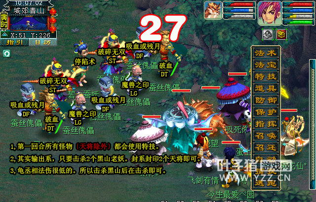 主线任务∶ 进入任务场景,一段动画。第一场战斗就是眼前的碧血蚕妖。 千年蛇魅∶ 主怪只会使用特技停陷术,不要管它。 天将∶门派ST,速度一般,物伤较高。 僵尸∶门派DF,速度较快,携带吸血和残月特技。 黑山老妖∶门派DT,速度一般,物理伤害一般,携带破血特技。 龟丞相∶门派LG,速度慢携带魔兽之印特技,法伤低。 小贴士∶ 1,第一回合所有怪物〔天将除外〕都会使用特技。 2,其实输出系,只要击杀2个黑山老妖。封系封印2个天将即可。 3,龟丞相法伤很低的。所以击杀黑山后在击杀即可。 叶子猪梦幻西游玩家群:1群 325703083 (2000人),2群: 330102322 (千人);3群: 424986787 (游戏疑难解答);4群: 330518295 (商人物价);5群: 1063086037 (疑难解答);6群: 1045753197 (春心萌动);7群: 787195090 (活跃互动);8群: 720665628 (全民PK)